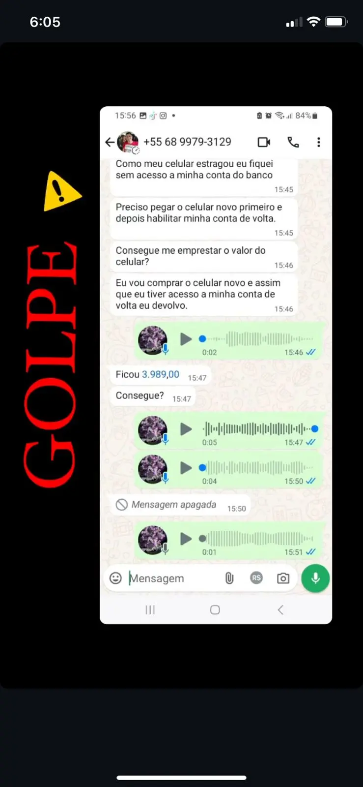 O deputado estadual Fagner Calegario, de Rio Branco, divulgou nesta sexta-feira (9), um alerta sobre uma tentativa de golpe que está circulando em seu nome. De acordo com o político, golpistas estão se passando por ele e solicitando dinheiro para a compra de um celular, alegando que a conta bancária dele está inacessível devido ao estrago do aparelho.