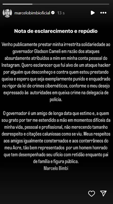 O influenciador e modelo acreano, Marcelo Bimbi, divulgou uma nota nos stories de sua conta no Instagram nesta quarta-feira (21) falando sobre as acusações de cunho sexual feitas ao governador Gladson Cameli, além de supostas ameaças. No texto, ele revela que foi hackeado e reconhece a amizade de Cameli.