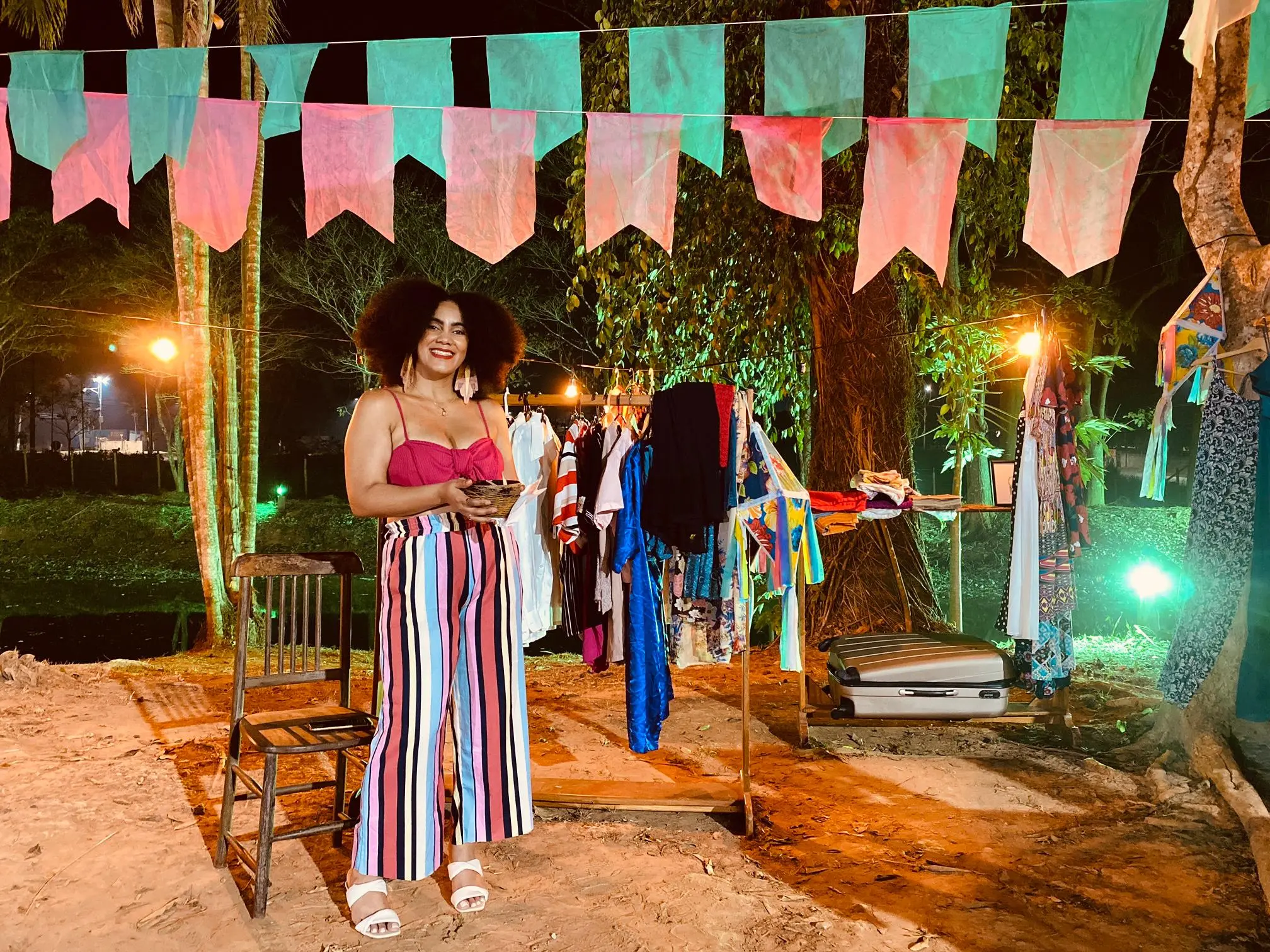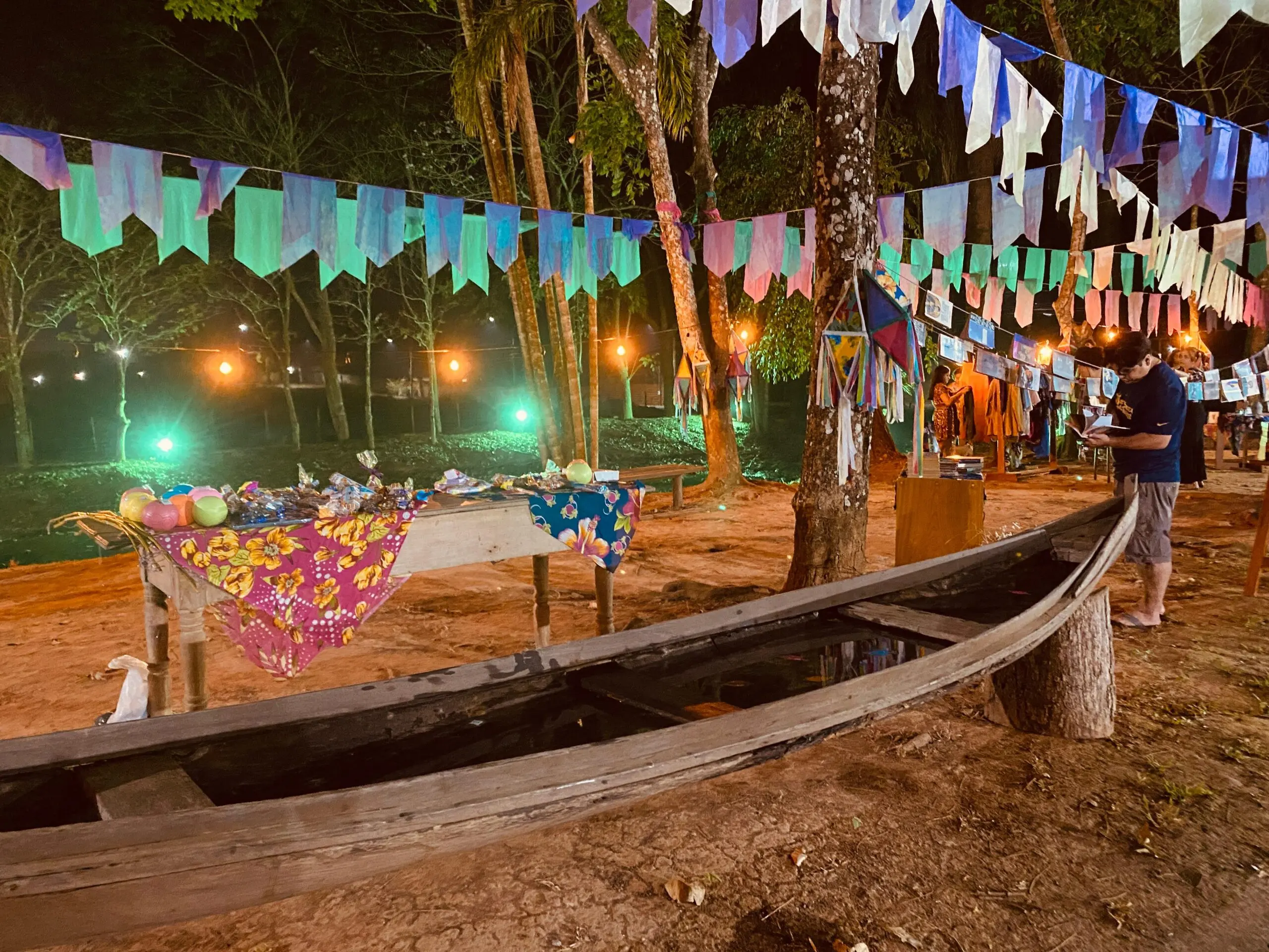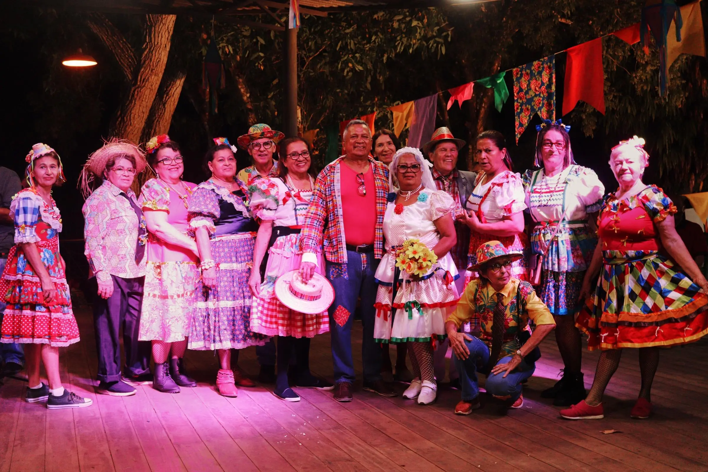 Neste ano, o arraial destaca saberes tradicionais como os contadores de histórias da floresta, rezadeiras e benzedeiras, parteiras e encantados, representando figuras folclóricas como o Boto, o Curupira e a Matinta Pereira.
