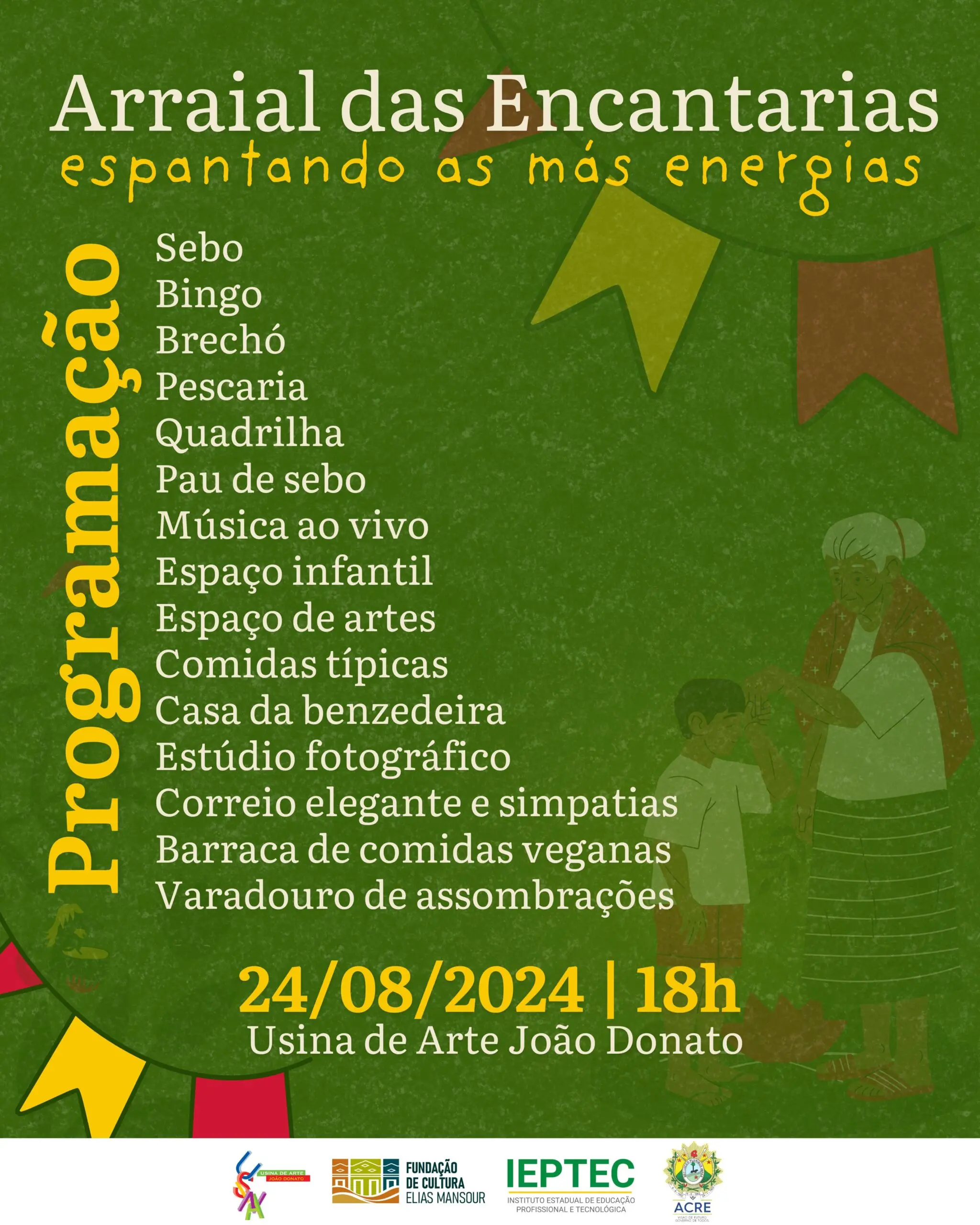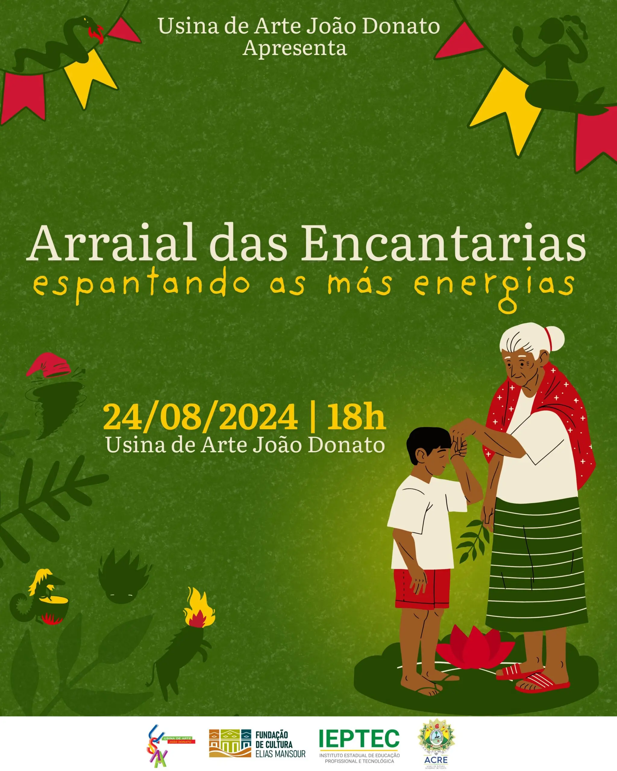 A Usina de Arte João Donato, em parceria com a Fundação de Cultura e Comunicação Elias Mansour e o Instituto Estadual de Educação Profissional e Tecnológica (Ieptec), realizará a 8ª edição do tradicional Arraial das Encantarias no dia 24 de agosto, a partir das 18 horas. Com o tema “Arraial das encantarias… espantando as más energias”, o evento celebra as riquezas da cultura amazônica e as tradições locais, trazendo à tona as identidades e memórias coletivas da região.