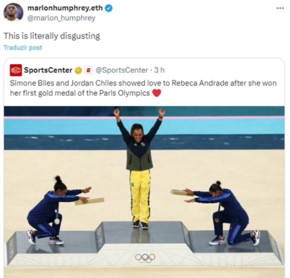 Enquanto o mundo assistia ao gesto de respeito e admiração de Simone Biles e Jordan Chiles ao reverenciar o ouro da brasileira Rebeca Andrade, nem todo mundo aprovou a imagem. O astro da NFL (liga de futebol americano), Marlon Humphrey, foi a público criticar Simone e Jordan, chamando o gesto de “literalmente nojento”.