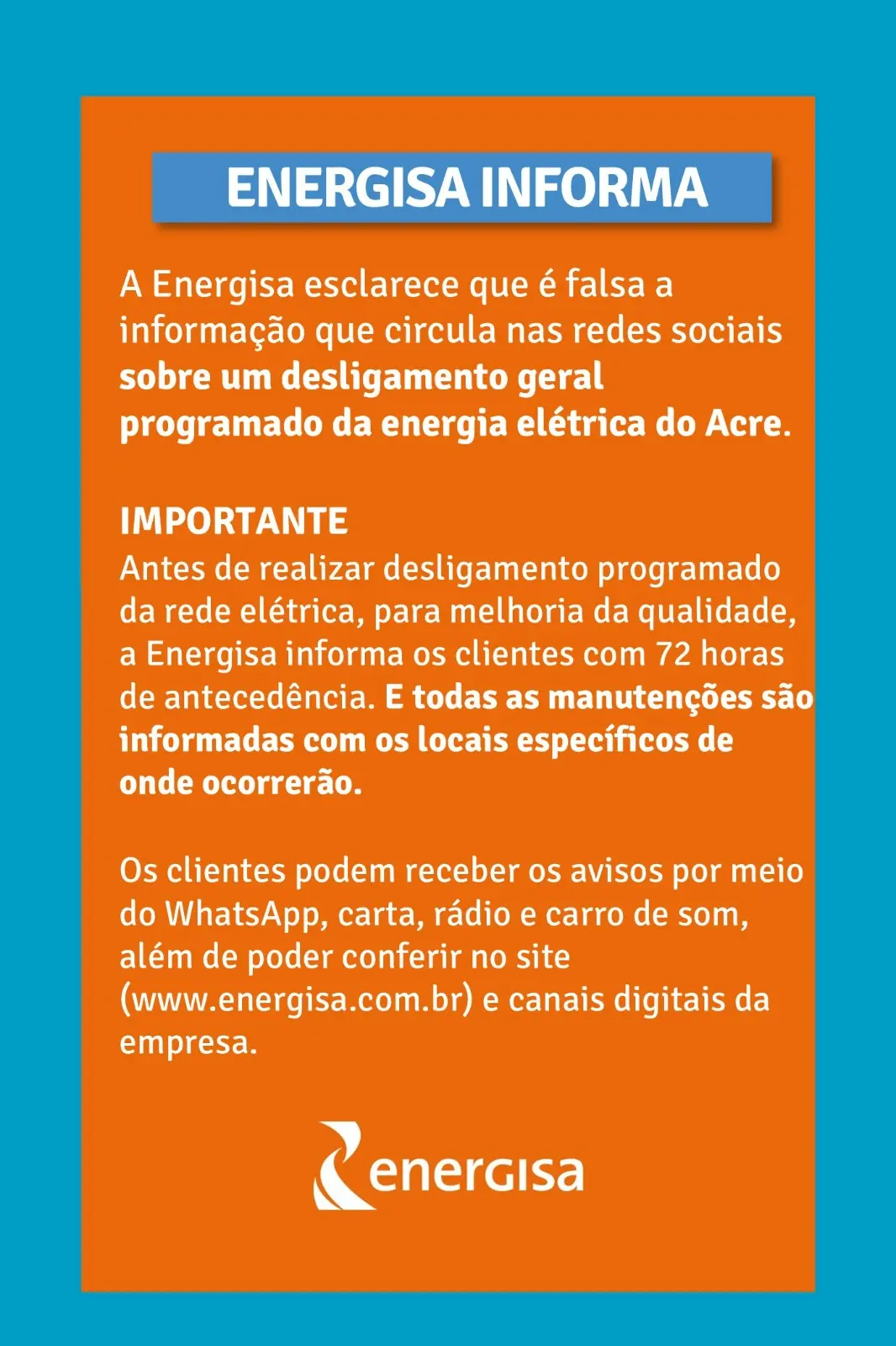 Os clientes podem receber os avisos por meio do WhatsApp, carta, rádio e carro de som, além de poder conferir no site www.energisa.com.br e outros canais digitais da empresa.
