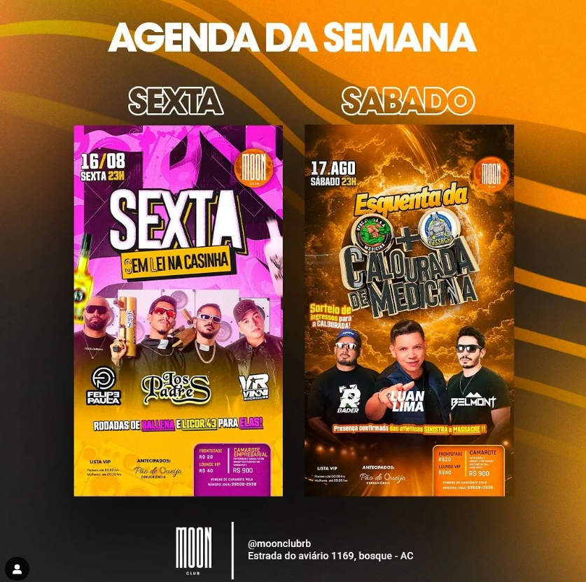 “Sexta Sem Lei” (16) com rodadas de Ballena e Licor 43 pra elas a noite toda na Moon Club. Sábado (17) tem “Esquenta da Calourada De Medicina” com sorteios de ingressos pra festa na Maison Borges, presença da galera da sinistra e massacre