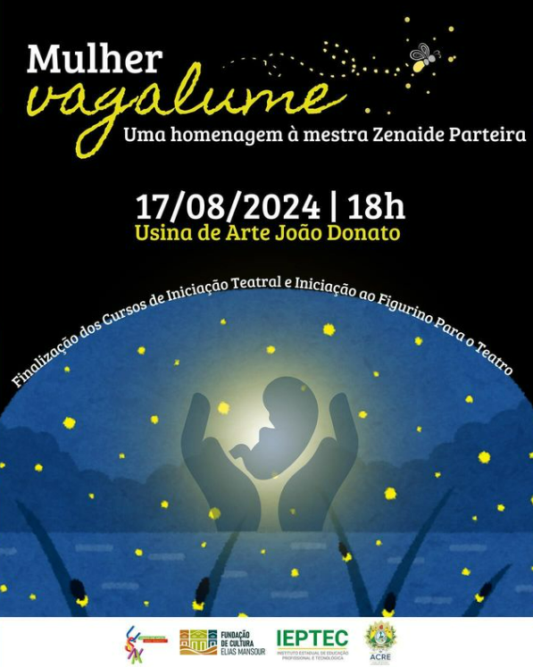 “Mulher Vagalume” é uma homenagem à mestra da cultura popular acreana Zenaide Parteira, feita pela turma do Curso Livre de Iniciação à Linguagem Teatral, da Usina de Arte João Donato no sábado (17) às 19h na Usina de Arte João Donato.