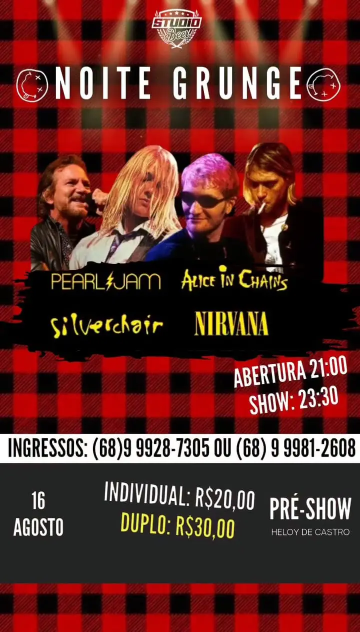 Na sexta (16) terá a Noite Grunge no Studio Beer. A partir das 23h30 muito Nirvana, Pearl Jam, Alice in Chains, SilverChair e mais.