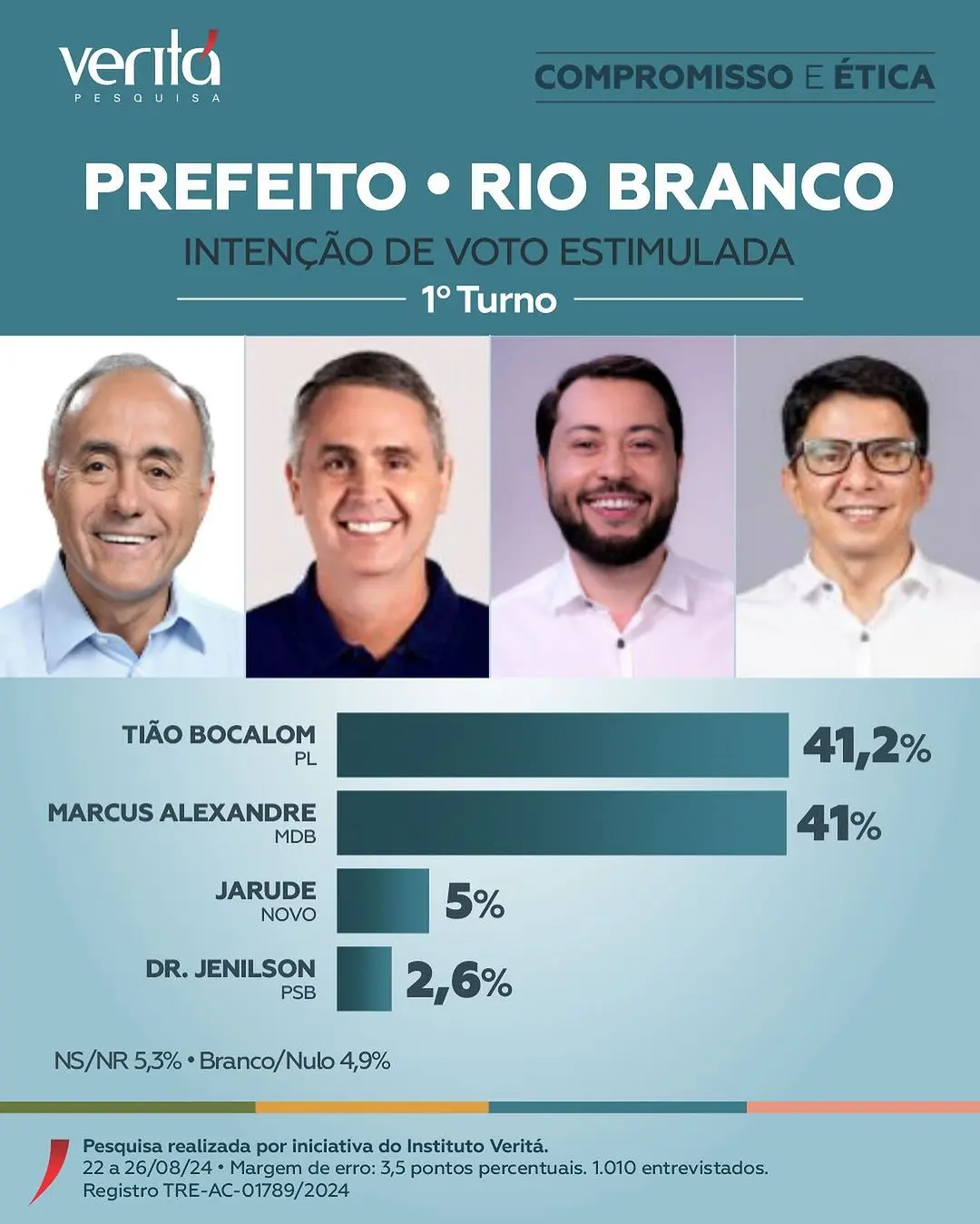 O estudo foi feito entre os dias 22 a 26 de agosto e entrevistou 1.010 eleitores com 16 anos ou mais, com uma margem de erro de 3,5 pontos percentuais e com registro no TRE-AC-01789/2024.