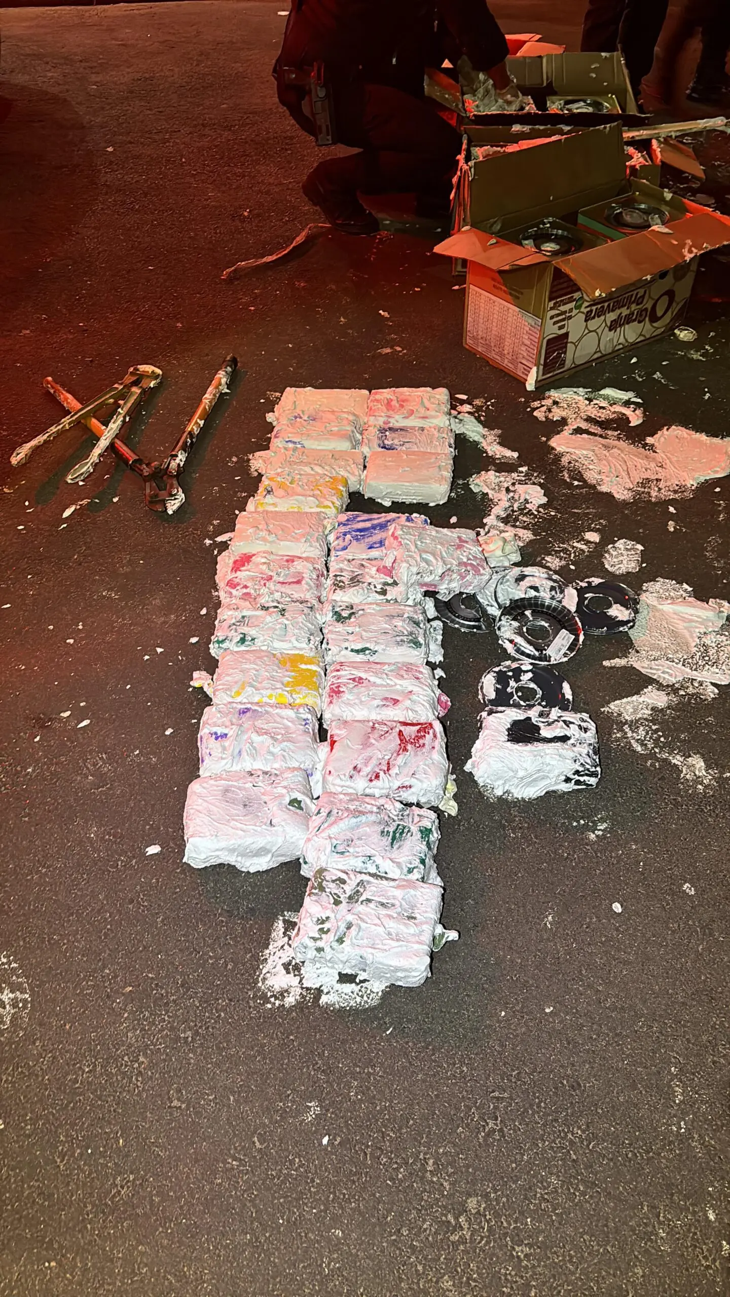 Junto às malas, foram identificadas cinco caixas de ovos contendo latas de tinta. Ao abrir os recipientes, a polícia encontrou os tabletes de skank, pesando quase 50 kg.