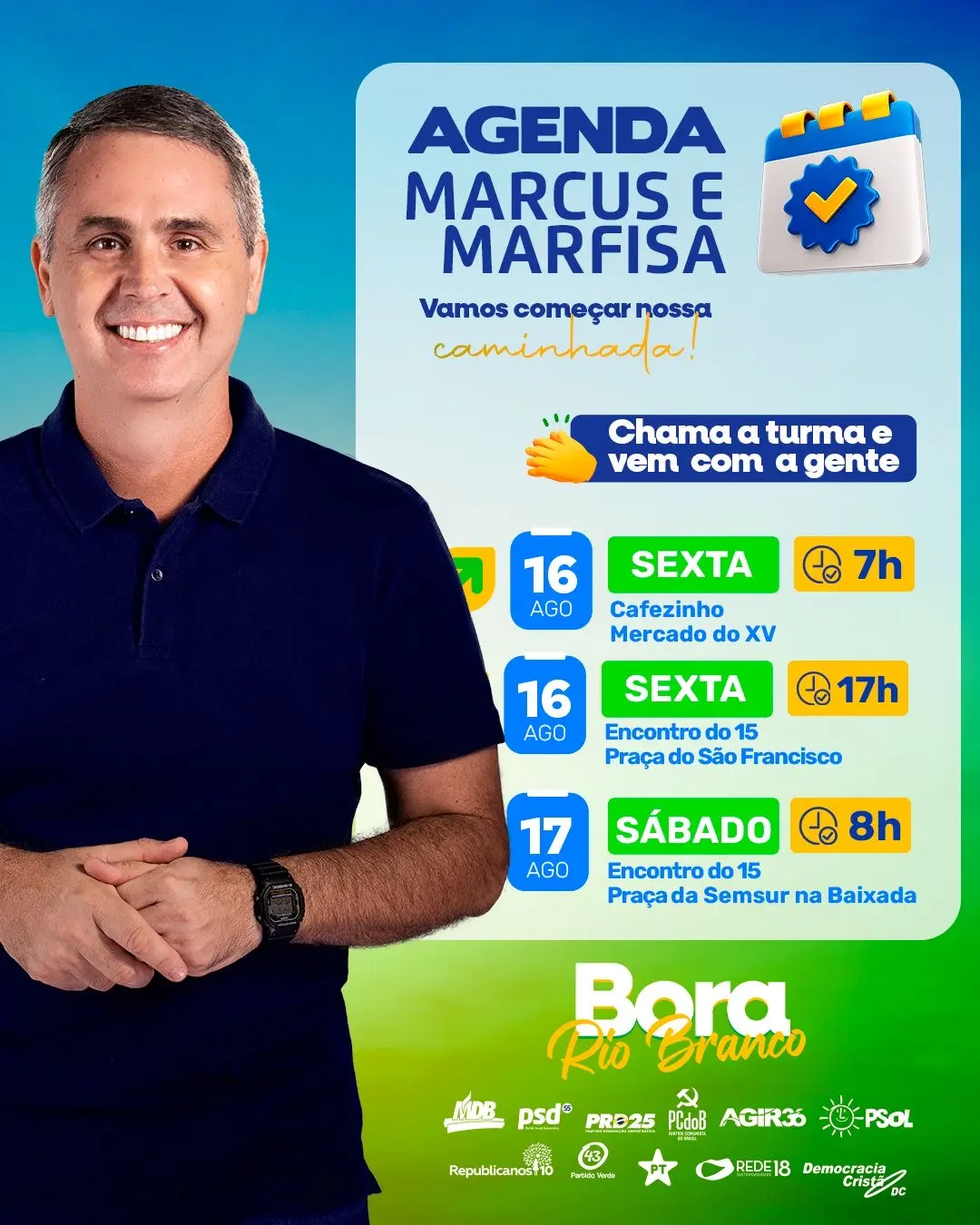 Já Marcus Alexandre, do MDB, tomará café às 7h no Mercado Municipal do bairro 15, no Segundo Distrito de Rio Branco. Após isso, às 17h, o ex-prefeito realiza um encontro com moradores na Praça do São Francisco.
