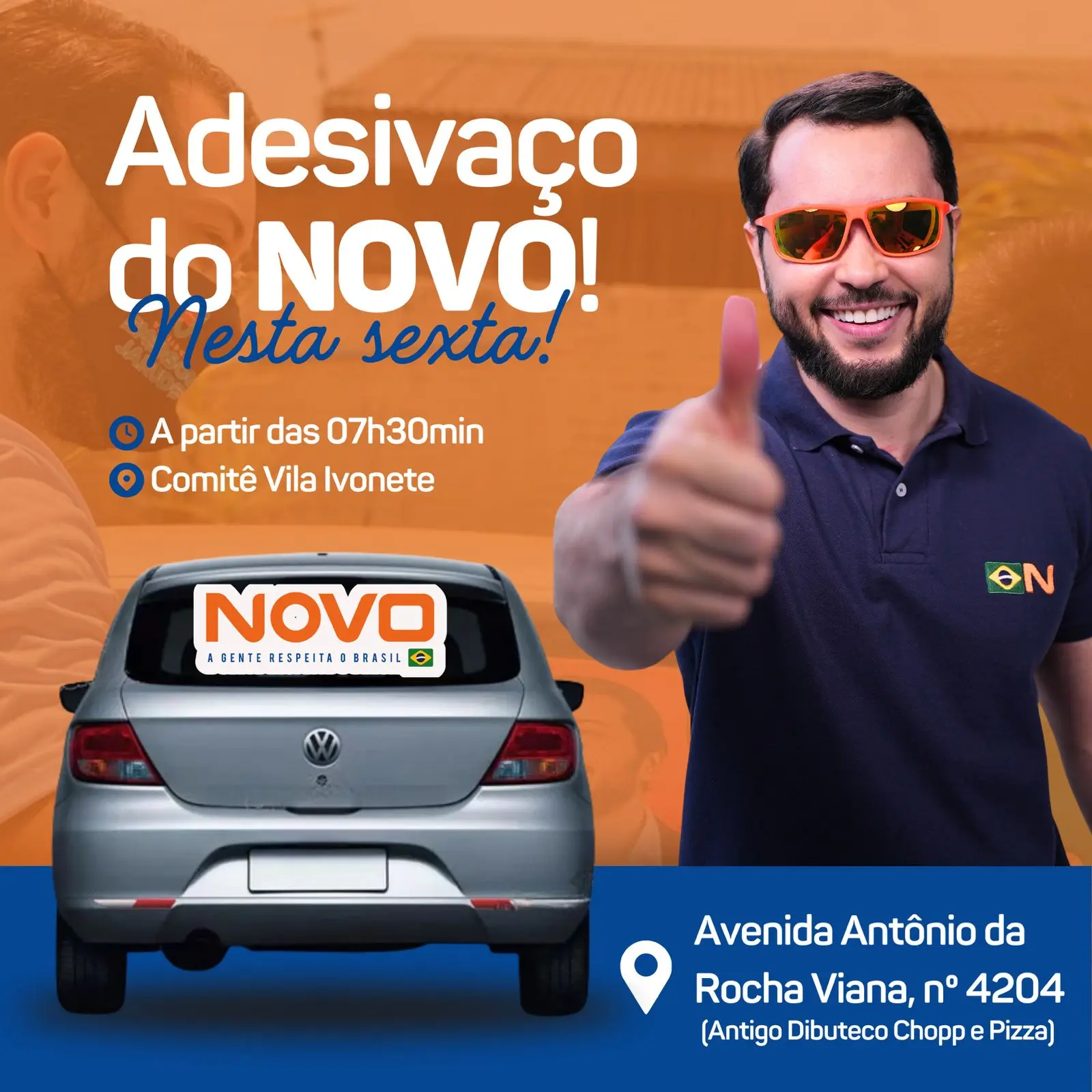 Emerson Jarude, do NOVO, realiza o ‘Adesivaço do NOVO’, a partir das 7h30, no Comitê Vila Ivonete. Além do adesivaço, ao logo do dia Jarude participa de reuniões com lideranças na parte alta da cidade e a noite se reúne com apoiadores no Segundo Distrito.