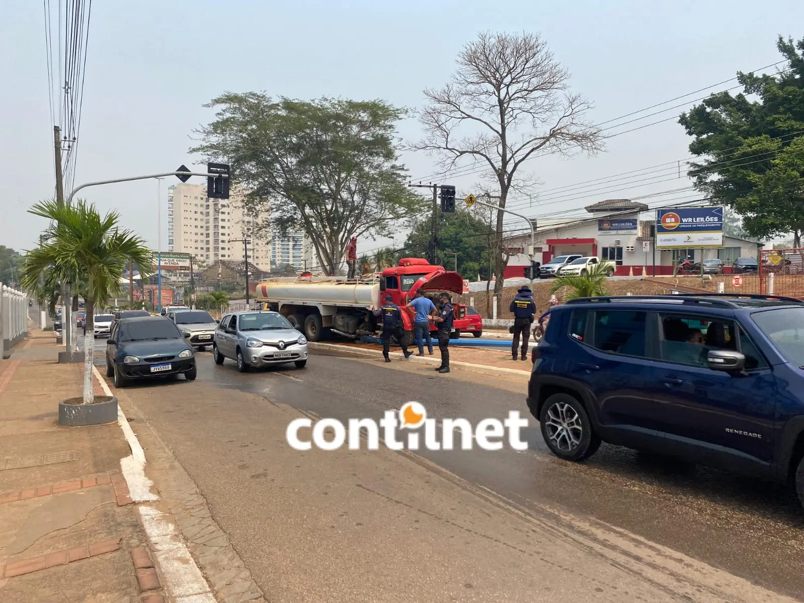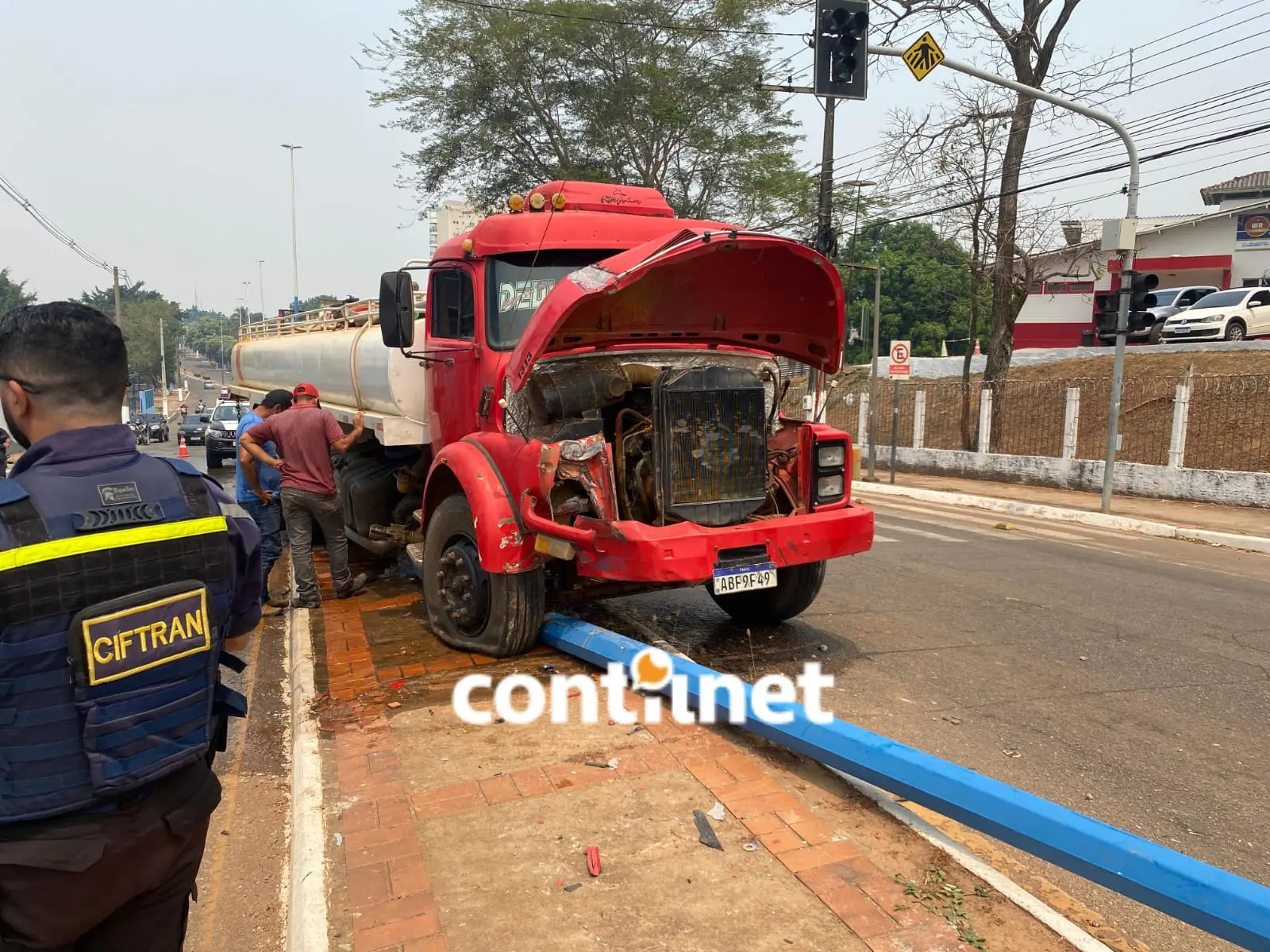 Um caminhão-pipa perdeu o controle, subiu em um canteiro e derrubou um poste na manhã desta segunda-feira (26), na Avenida Antônio da Rocha Viana, no bairro Santa Quitéria, em Rio Branco.