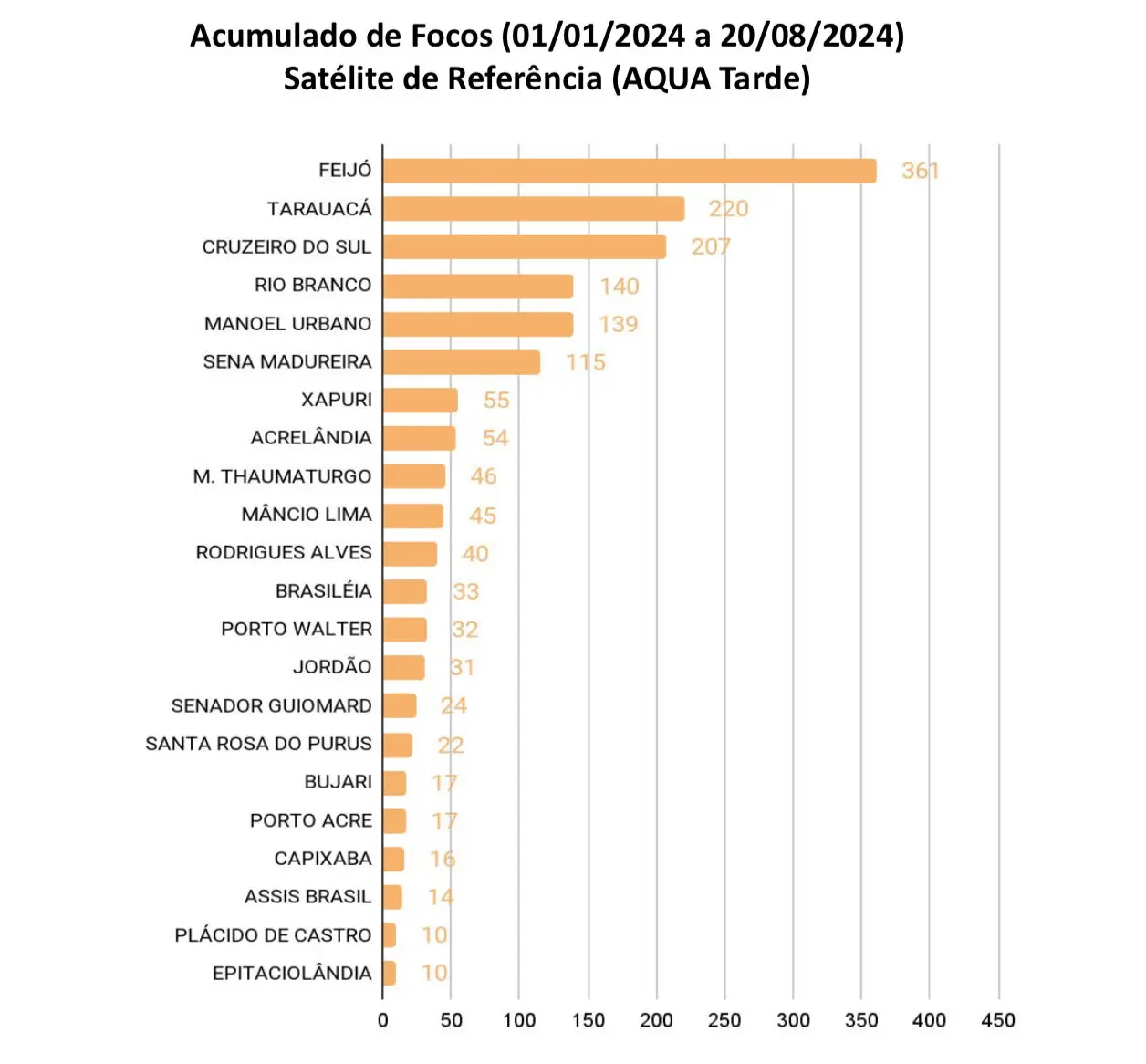 A capital Rio Branco aparece na quarta posição no ranking, com 140 focos. Os dados são do Satélite de Referência AQUA. No sentido contrário, Epitaciolândia (10) e Plácido de Castro (10) estão em os municípios com menores números.