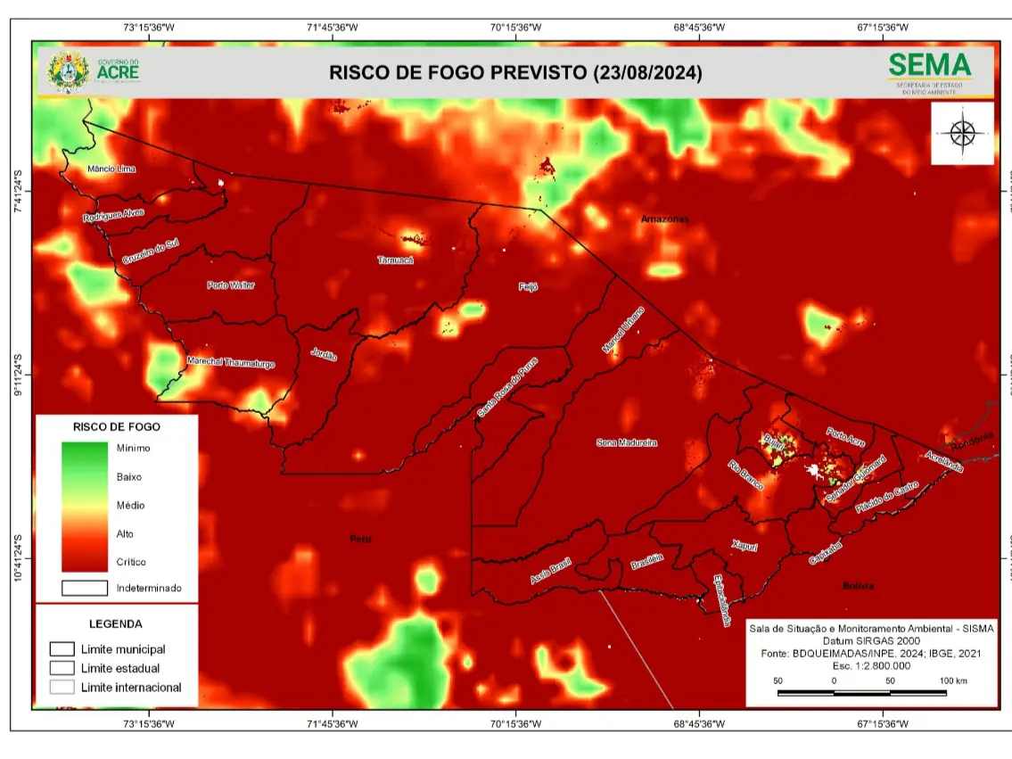 O risco de fogo Mínimo a Baixo é previsto em áreas isoladas dos municípios de Senador Guiomard, Rio Branco, Bujari, Feijó, Marechal Thaumaturgo e Mâncio Lima. O risco de fogo Médio, Alto e Crítico é previsto em todo estado.