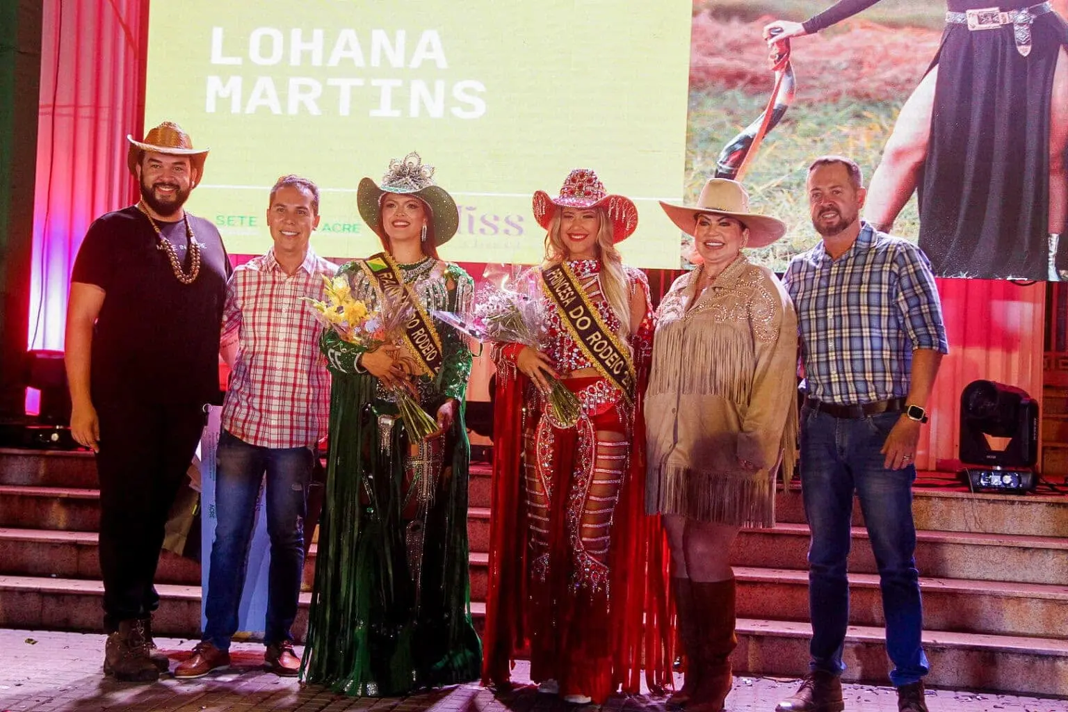 Secretário Marcelo Messias, colunista e organizadora Roberta Lima, Rainha do Rodeio da Expoacre 2023, Lohana Martins, Princesa Maiane Sobrinho, colunista e organizador, Gigi Hanan e influencer Luiz Vasconcelos/Foto: Neto Lucena/Secom