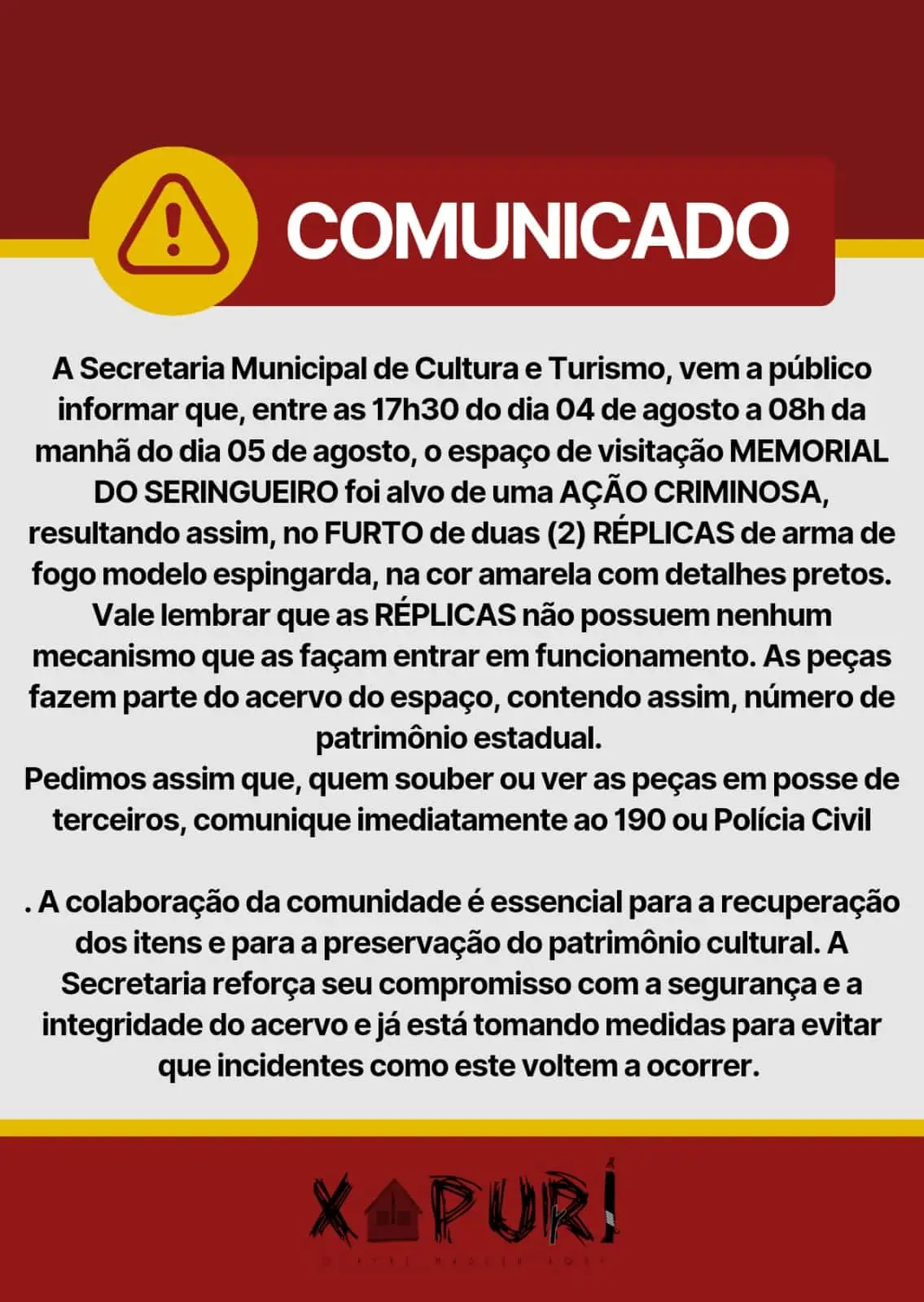 Duas réplicas de espingardas foram roubadas do Memorial do Seringueiro, localizado ao lado da Casa de Chico Mendes, em Xapuri. O furto ocorreu na manhã desta segunda-feira (05).