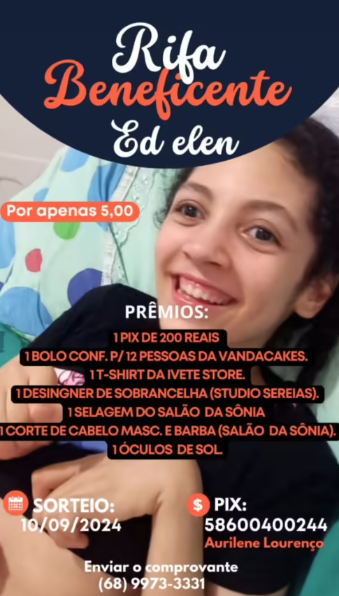Para ajudar a suprir essas despesas, a família está realizando uma rifa com o valor de R$5,00 por bilhete. Os recursos arrecadados serão destinados a cobrir os gastos com o tratamento e outras necessidades médicas de Ed Elen. Os interessados em participar podem adquirir os bilhetes através do número de contato da mãe da adolescente, (68) 99973-3331. A rifa inclui diversos prêmios e tem como objetivo principal garantir o suporte necessário para a continuação do tratamento.