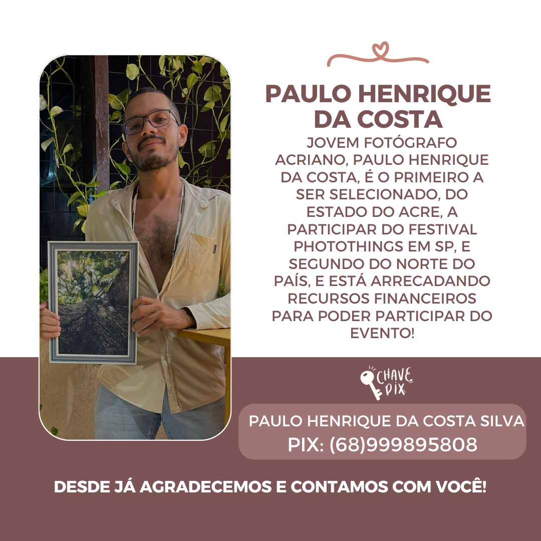 O artista visual Paulo Henrique Costa, de Cruzeiro do Sul, Acre, está representando o Acre no festival Photothings, em São Paulo. Ele apresenta o ensaio fotográfico “Vidas Amazônidas: Retratos de um Acre que Resiste”.