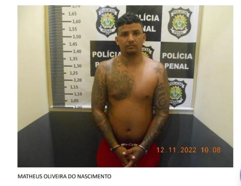 Matheus Oliveira do Nascimento foi preso na noite desta segunda-feira, 12, no Conjunto Esperança, em Rio Branco. Ele é o terceiro dos seis detentos que fugiram no dia 8 de agosto, do presídio Francisco de Oliveira Conde.