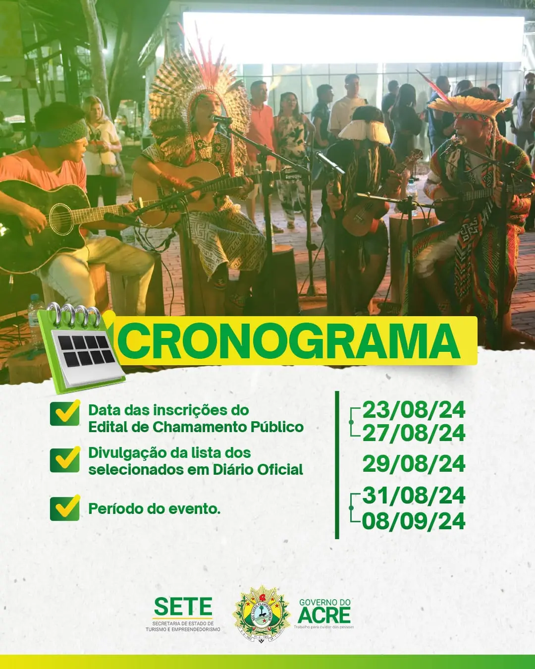 O edital foi publicado no Diário Oficial do Estado (DOE) desta sexta-feira, 23, pelo governo do Acre, por meio da Secretaria de Estado de Turismo e Empreendedorismo (Sete), com o objetivo de divulgar e fortalecer a cultura dos povos originários do Acre. A Sete será responsável pela disponibilização do espaço para apresentação representativa de oca indígena.