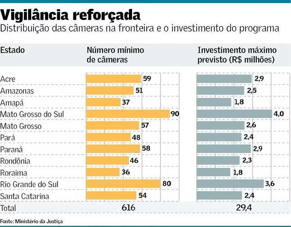 Um projeto do Ministério da Justiça e Segurança Pública, orçado em mais de R$ 29 milhões, vai instalar câmeras de vídeos e monitorar a faixa das fronteiras do país.