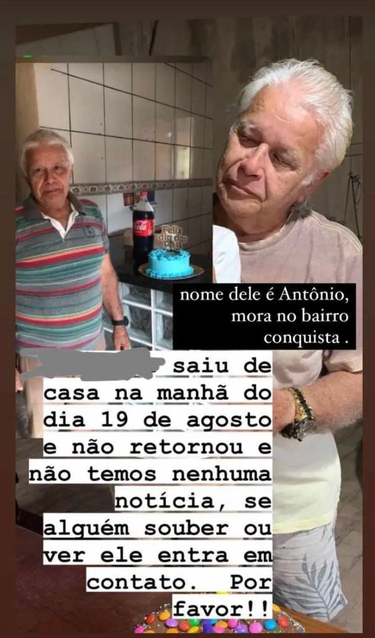 A família conta que a idade avançada e a facilidade com que se irrita possam ter levado Antônio a sair de casa de forma repentina. Qualquer pessoa que tenha informações sobre o paradeiro do idoso pode contatar a família pelo número (68) 99211-0917 ou se dirigir à Delegacia de Polícia mais próxima.