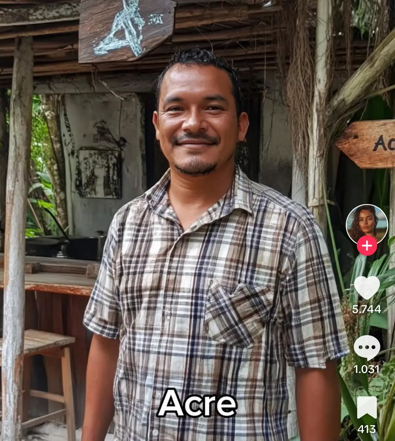 No vídeo, o homem comum do Acre tem pele negra, usa blusa de botão e calça jeans, tem cavanhaque e aparenta estar em uma casa simples, com telhado de palha.