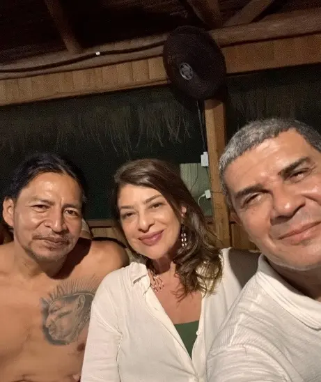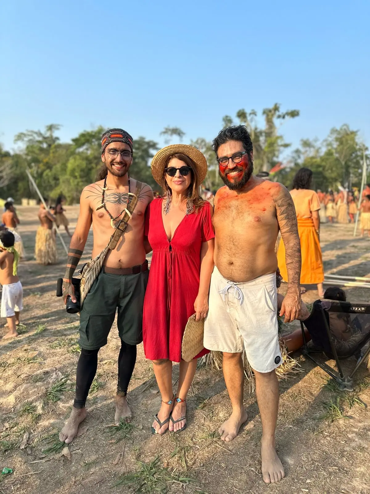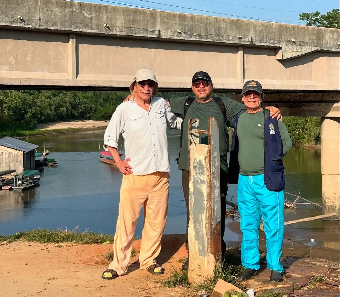 Os jornalistas Altino Machado e Nélson Liano estavam presentes, acompanhando o amigo de profissão Rodrigo Mesquita, fundador do jornal Estadão. Na foto, o trio às margens do rio Gregório, no embarque para a aldeia