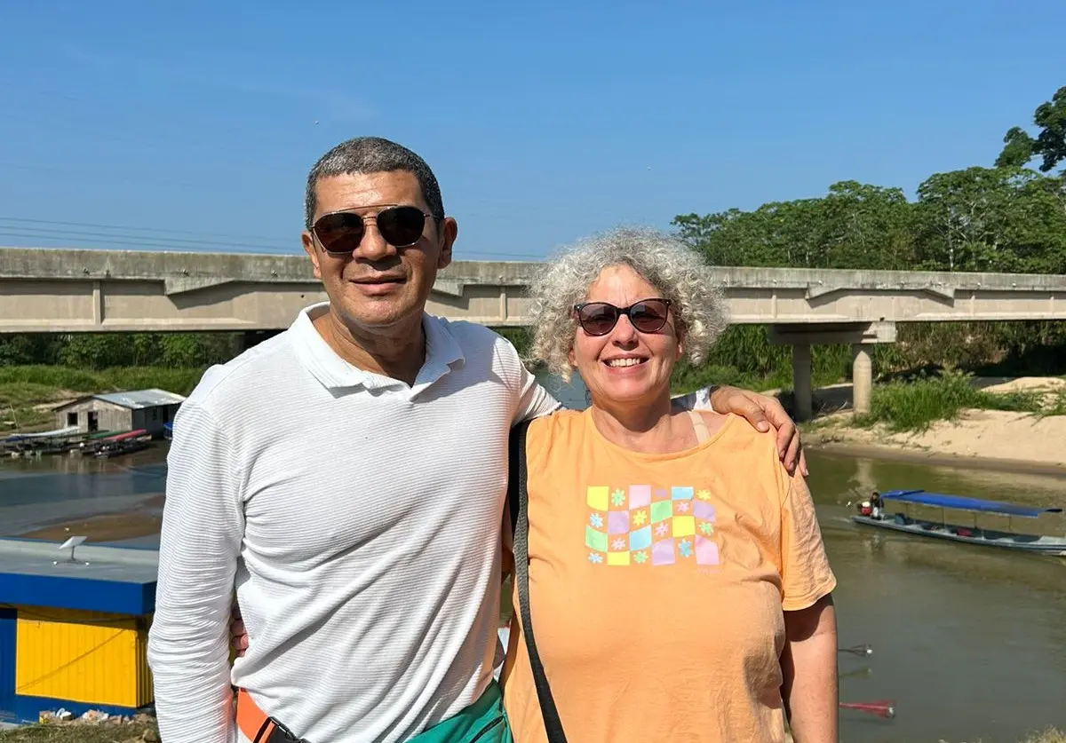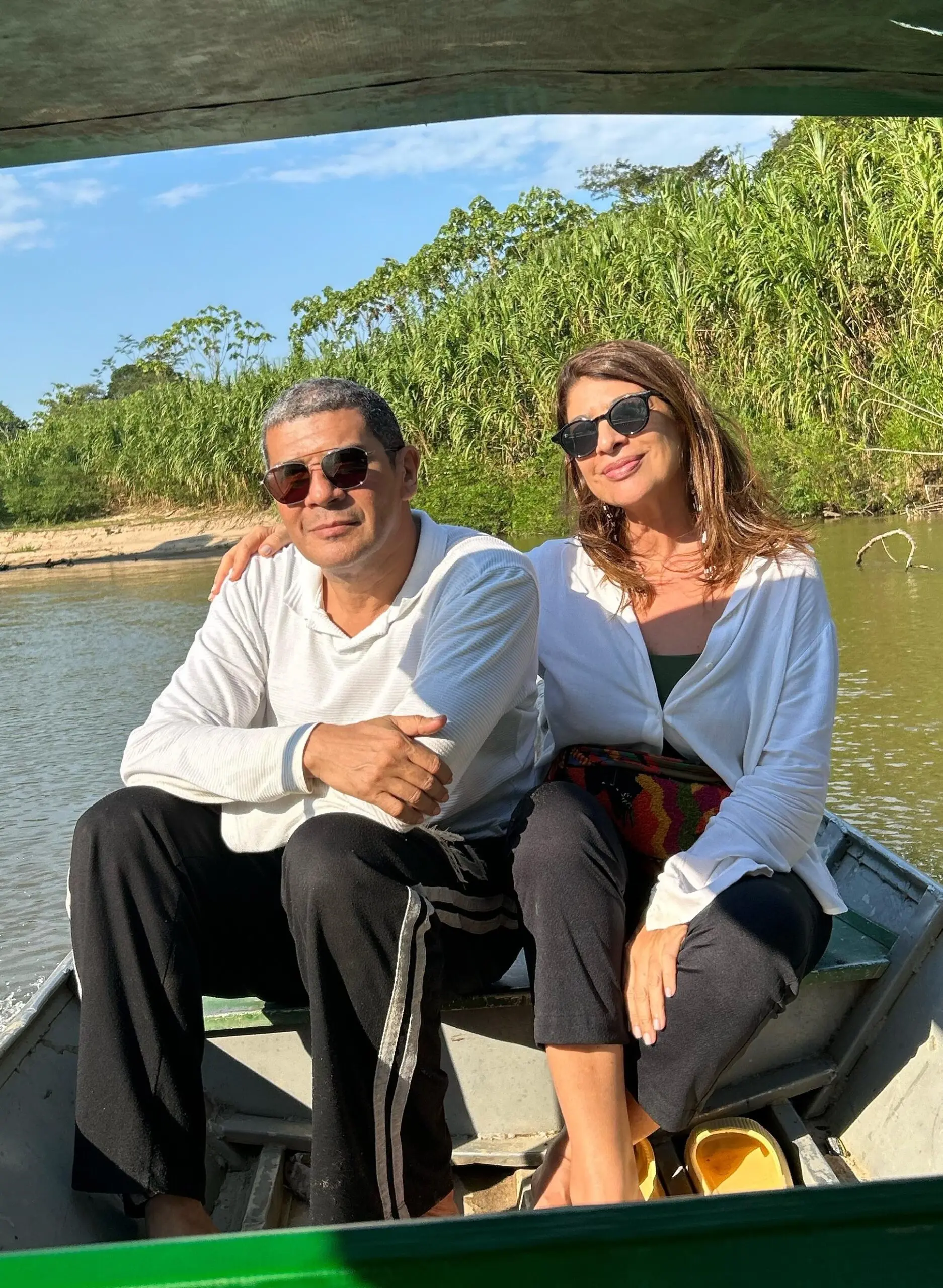 O coordenador do FestCine Originários Moisés Alencastro e a produtora dessa edição, Jackie Pinheiro, na viagem de barco pelo Rio Gregório