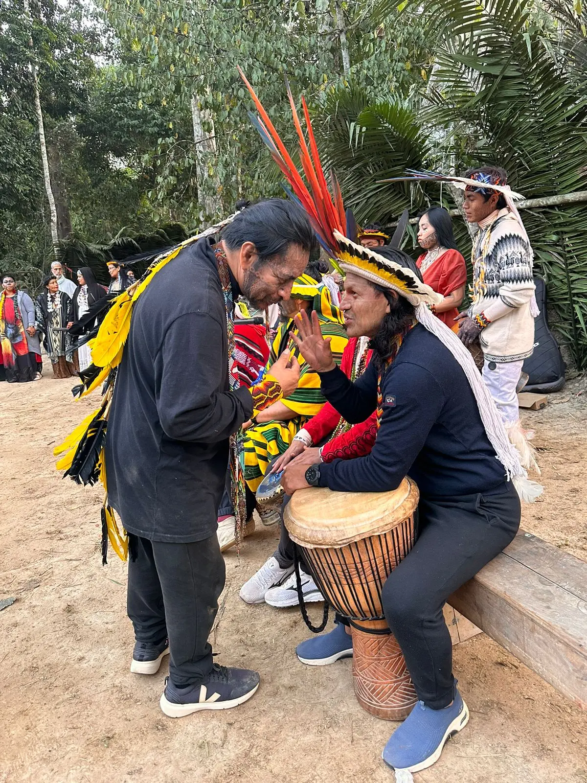 E na chegada na aldeia Mutum, com o cacique geral Tashka Yawanawa