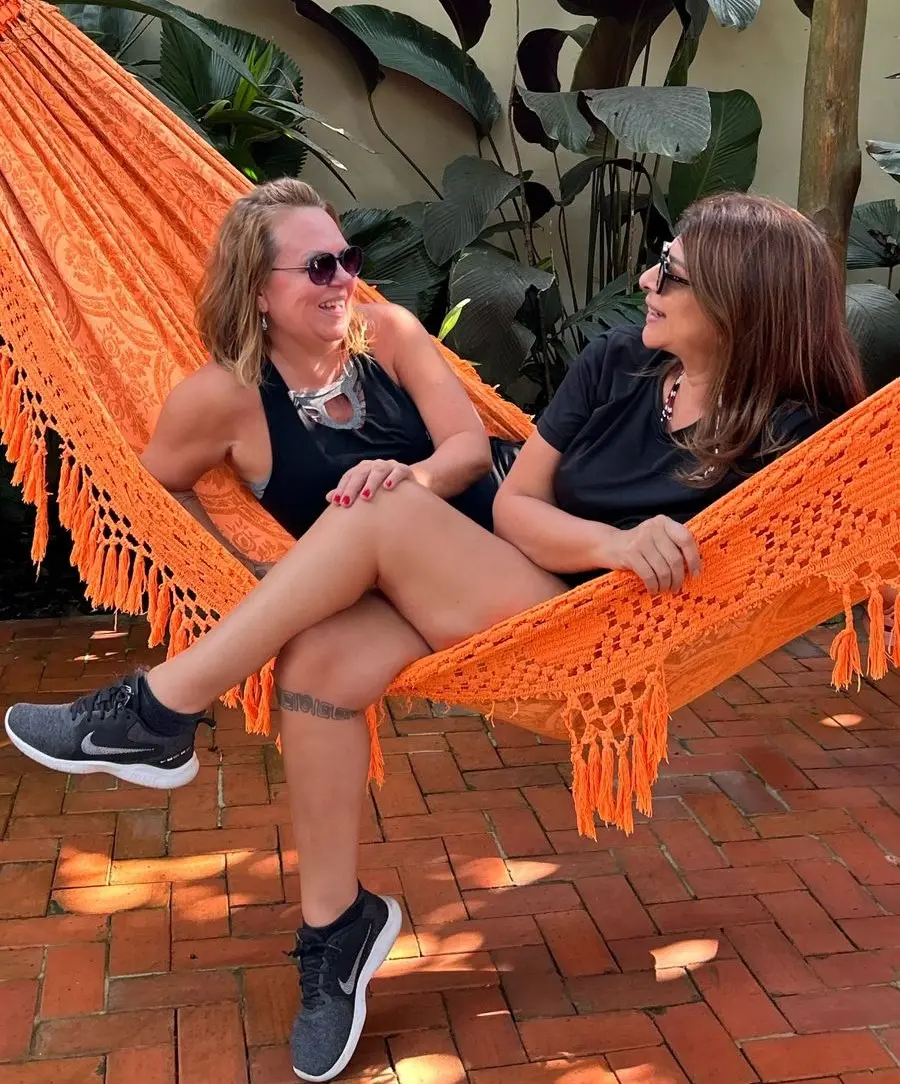 Minha querida amiga Marilene Costa, que hoje reside em João Pessoa, com a filha Thainá Matias, passou o mês de julho em Rio Branco revendo familiares, a pedido do filho Thales Matias. Na foto, nós duas na rede colorida do restaurante Mata Nativa, onde almoçamos com familiares dela, após um treininho na Smart Fit.
