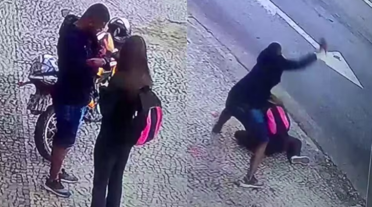 Imagens de uma câmera de segurança obtidas pelo g1mostram o momento em que Vitória Alves Silva, de 22 anos, e Wallef César Oliveira Gonçalves, de 27, conversam na calçada. Ao perceber que o homem está com uma faca, a vítima é atingida várias vezes.