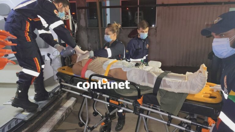 A vítima sendo transportada para o PS, com suporte de oxigênio e assistência médica devido ao estado gravíssimo em que se encontra/Foto: ContilNet