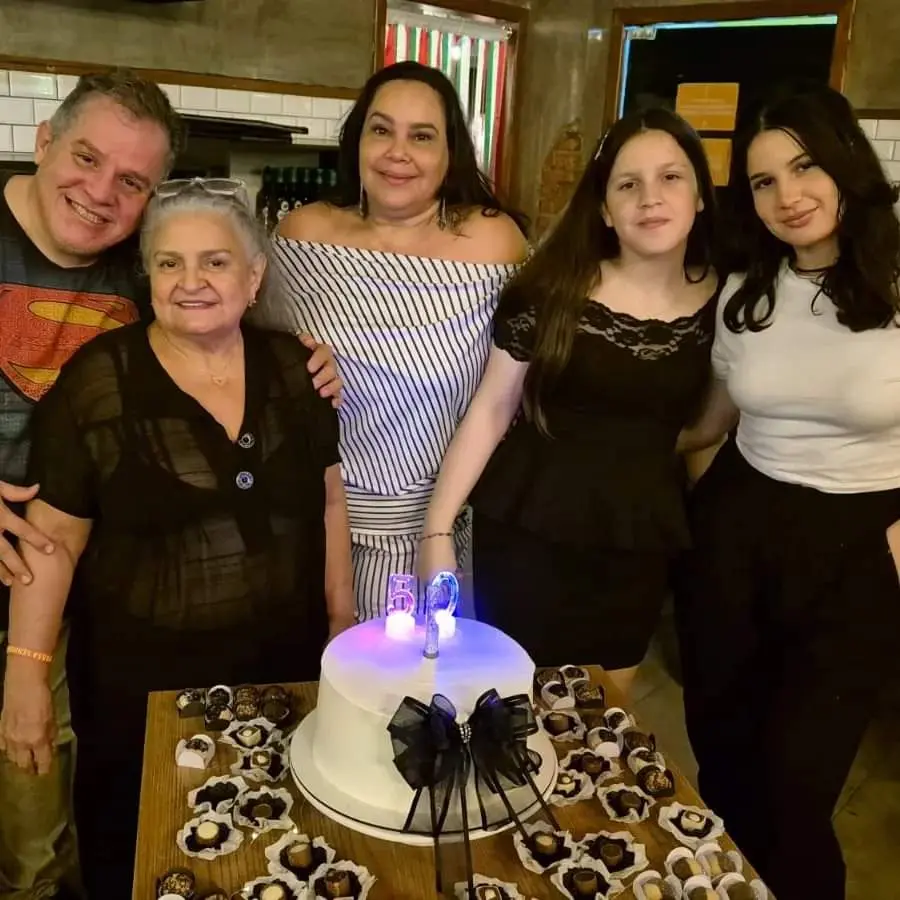 Adriana Dantas cinquentou e festejou de modo intimista em jantar com amigos e familiares. Na foto com o maridão Pancho Roque, a sogra Dilse Rique e as filhas Isabela e Gabriela no Deck Trattoria.