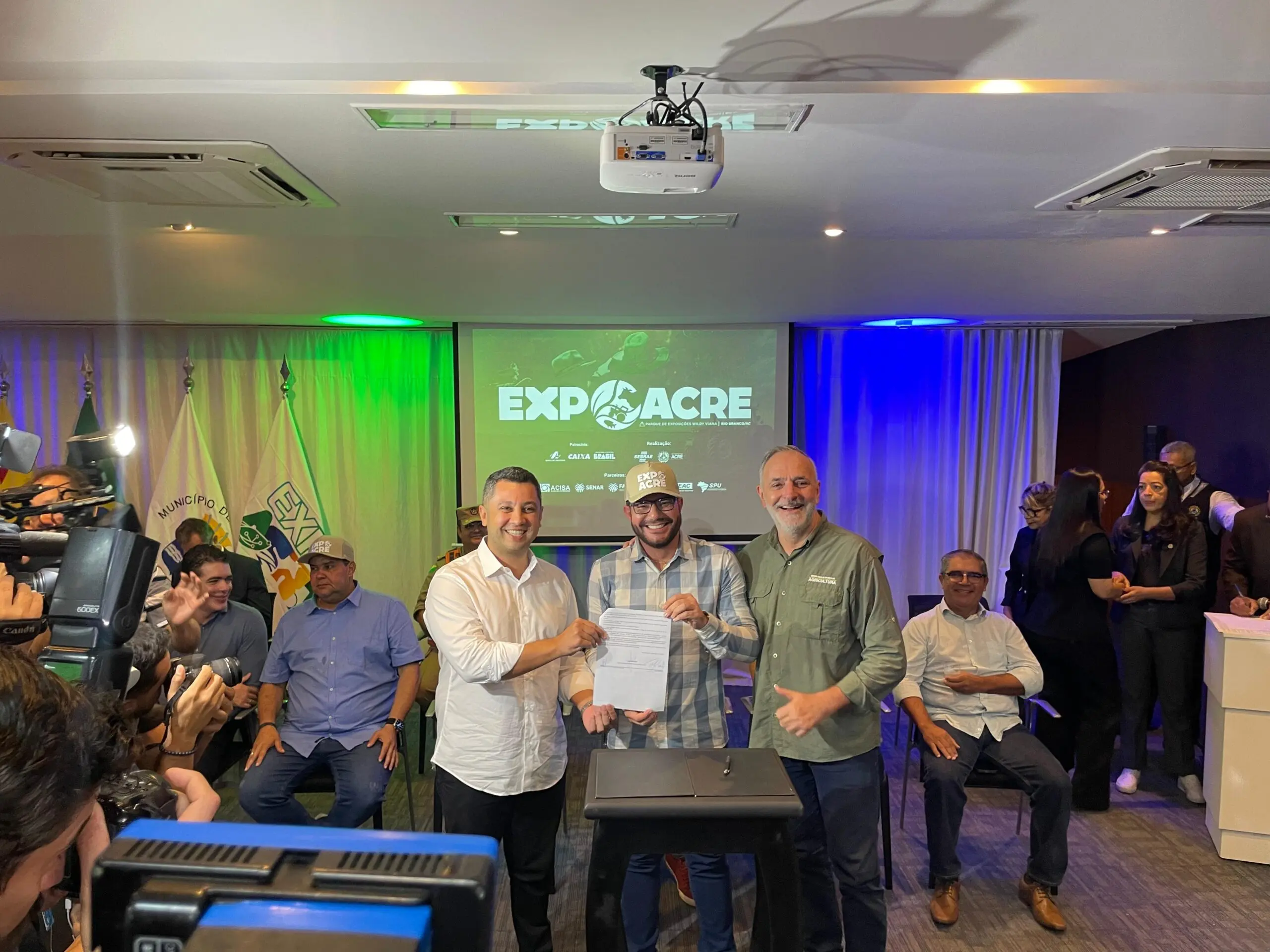 Gladson, o secretário de Agricultura do Estado, Luiz Tchê, e o superintendente do Patrimônio da União no Acre, Thiago Mourão, assinaram o termo de concessão do parque de exposições Wildy Viana para o evento.
