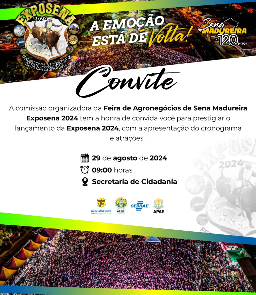 A Feira de Agronegócios de Sena Madureira, popularmente conhecida como Exposena, terá sua edição de 2024 oficialmente lançada nesta quinta-feira, 29 de agosto. O evento, um dos mais aguardados da região, contará com a apresentação completa do cronograma e das atrações que prometem movimentar a cidade. A cerimônia de lançamento ocorrerá às 9h, na Secretaria de Cidadania.