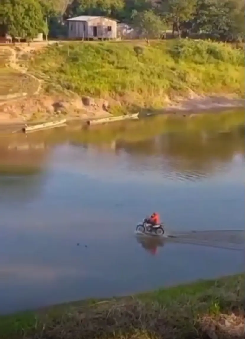 No vídeo, é possível ver tanto pessoas caminhando tranquilamente quanto um motociclista pilotando no leito seco do rio. A situação é um reflexo dramático da baixa significativa no nível das águas.