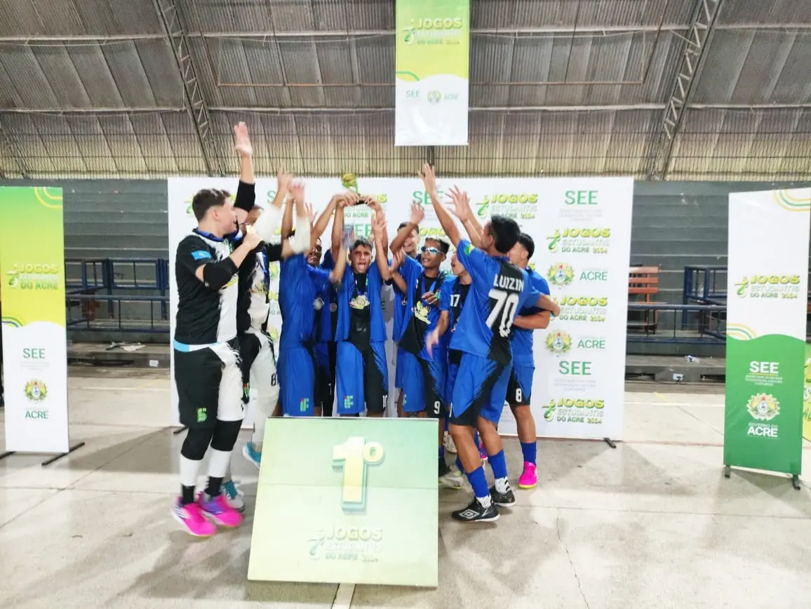 Jogadores de Sena Madureira comemoram a conquista do troféu de campeão do Campeonato Estadual de Futsal Sub-17. A vitória veio após uma jornada de jogos intensos e muito empenho/Foto: Arquivo pessoal