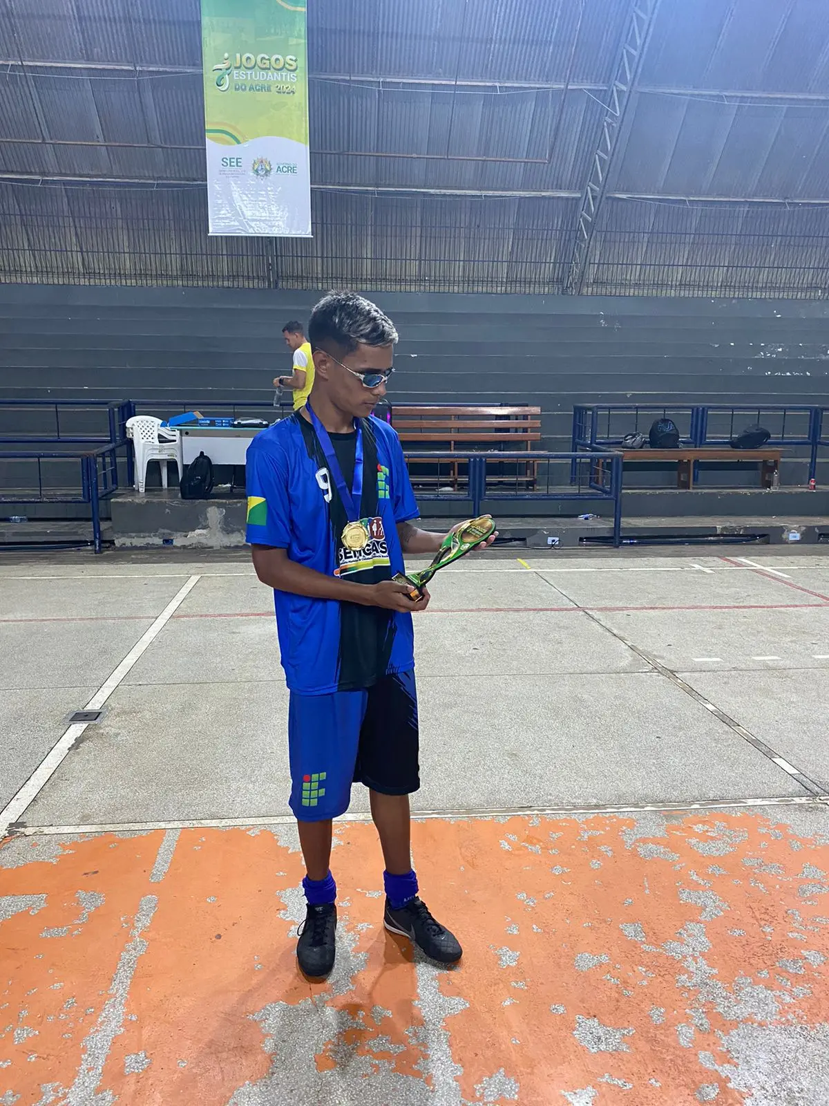 Yan Pablo, conhecido como Gabigol, exibe orgulhoso o troféu de artilheiro do Campeonato Estadual de Futsal Sub-17, com seis gols marcados/Foto: Arquivo pessoal