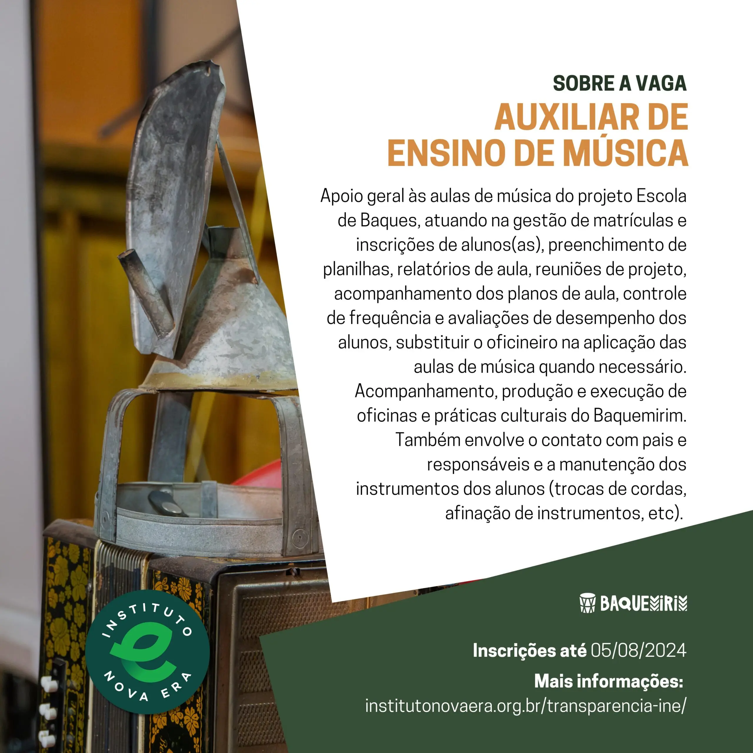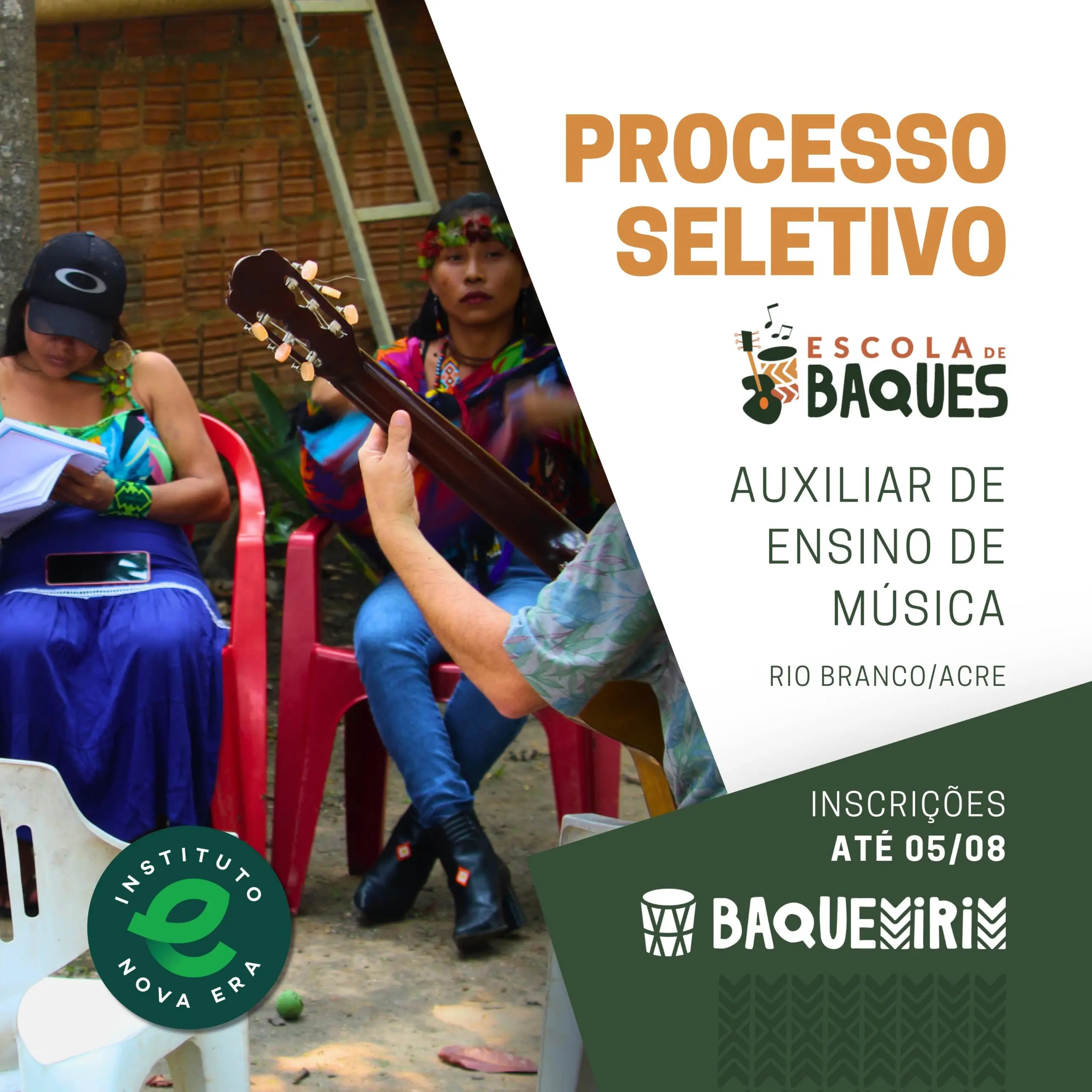 O Baquemirim | Instituto Nova Era abriu mais um processo seletivo, agora para a vaga de Auxiliarde Ensino de Música. O trabalho é presencial e acontece no bairro Irineu Serra em Rio Branco/AC.