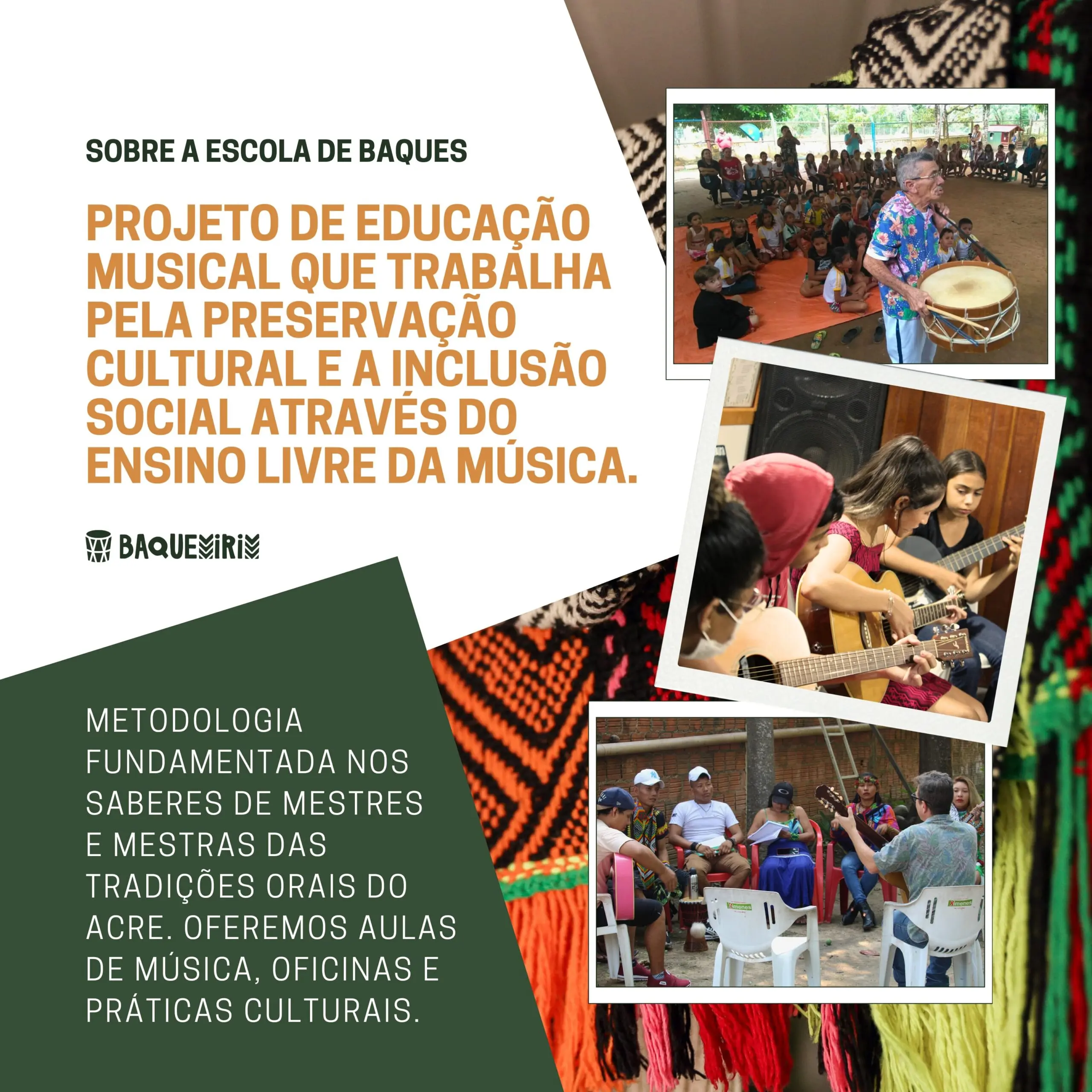 A Escola de Baque é um projeto de educação musical que através de uma abordagem descolonial trabalha para valorizar, revitalizar, fortalecer e difundir práticas musicais e outras manifestações culturais apresentadas e ensinadas por mestras e mestres das tradições orais dos povos da floresta acreana.