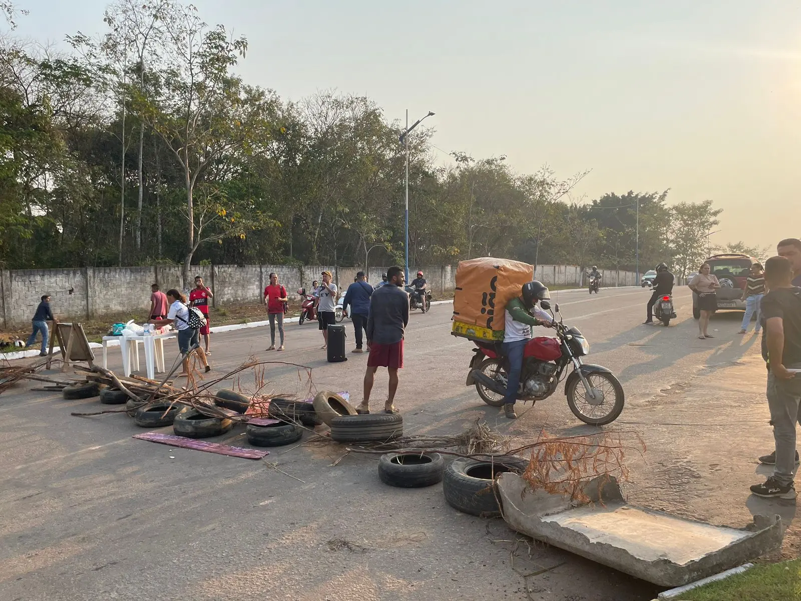 Com pneus, cadeiras e bicicletas, os moradores interditaram a Estrada do Calafate, que já causa um engarrafamento grande de veículos no momento.