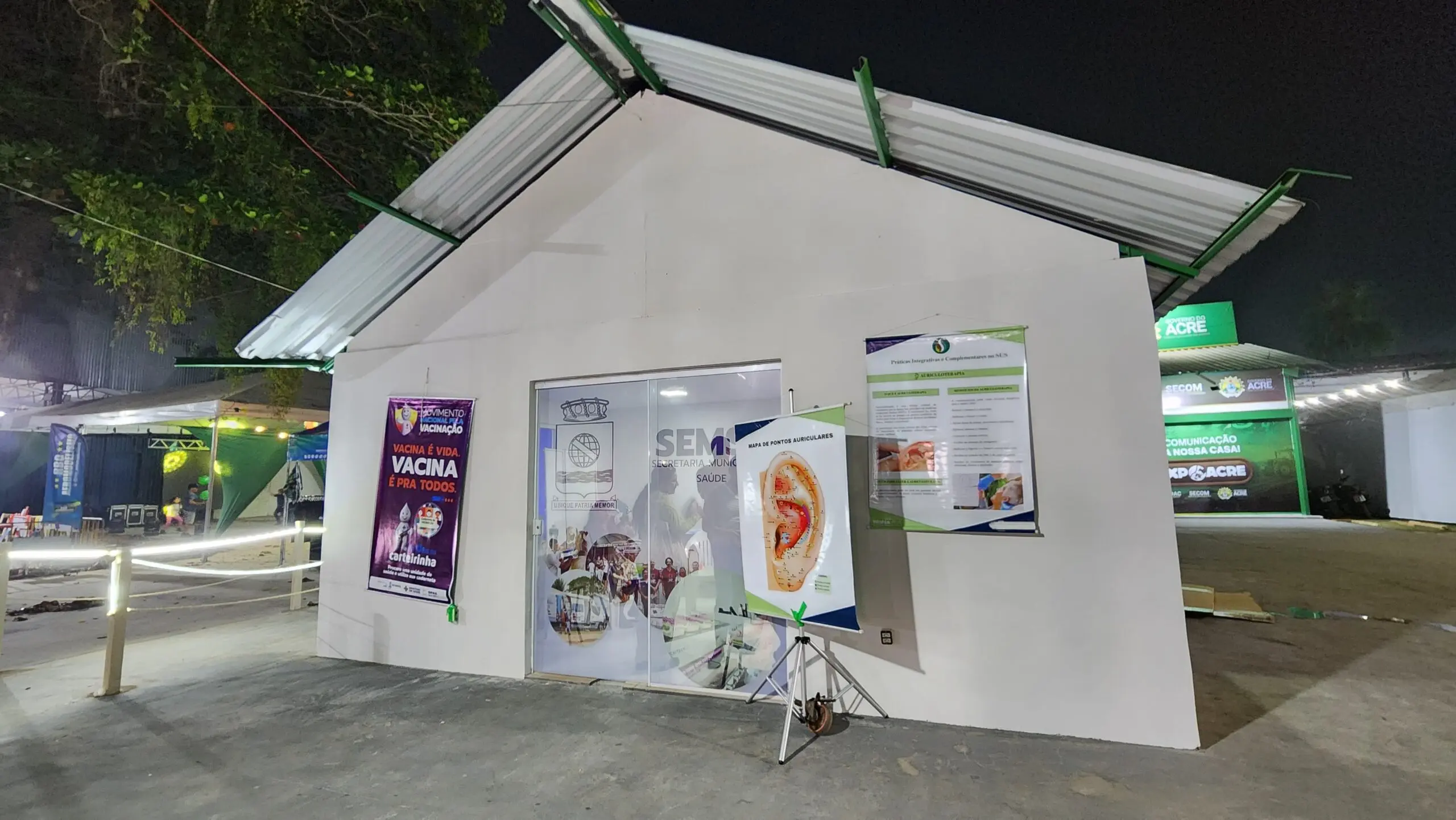 A entrada do posto da Secretaria Municipal de Saúde (Semsa) na Expoacre 2024, localizado atrás do estúdio do ContilNet, na rua principal do Parque de Exposições/Foto: Juan Diaz, ContilNet