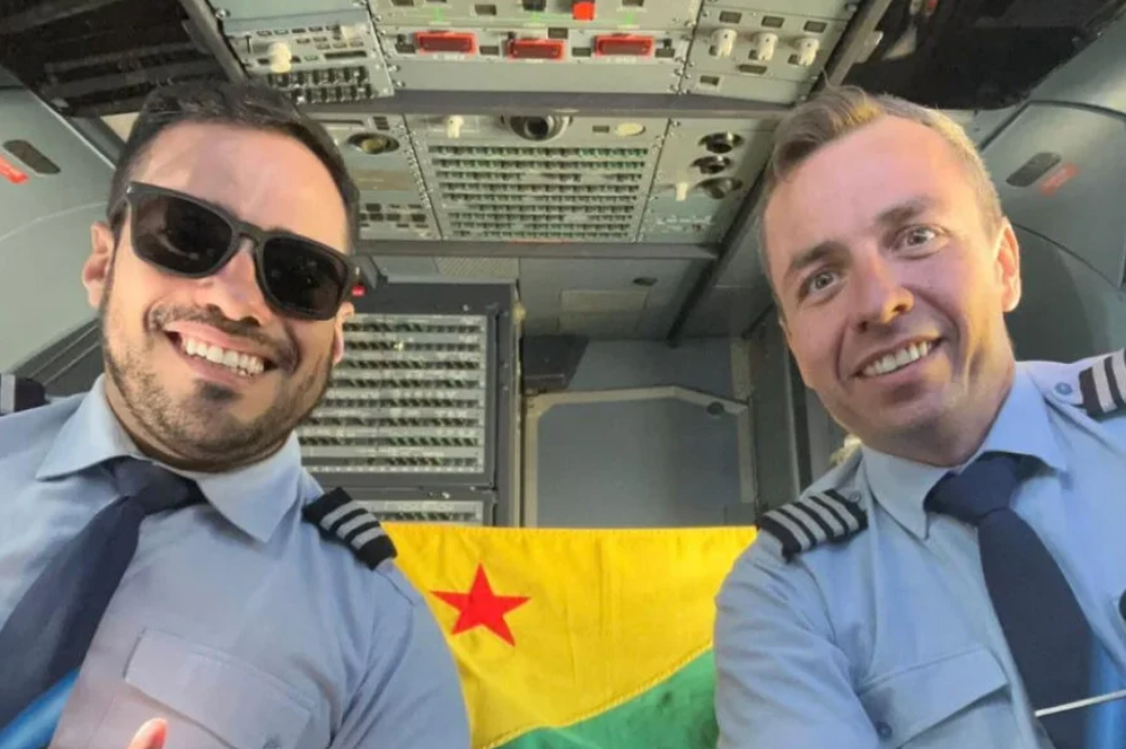 Bruno Rodrigues e Sidney Cunha, acreanos e pilotos da Azul Linhas Aéreas, prontos para conduzir o voo de retorno ao Acre/Foto: Reprodução