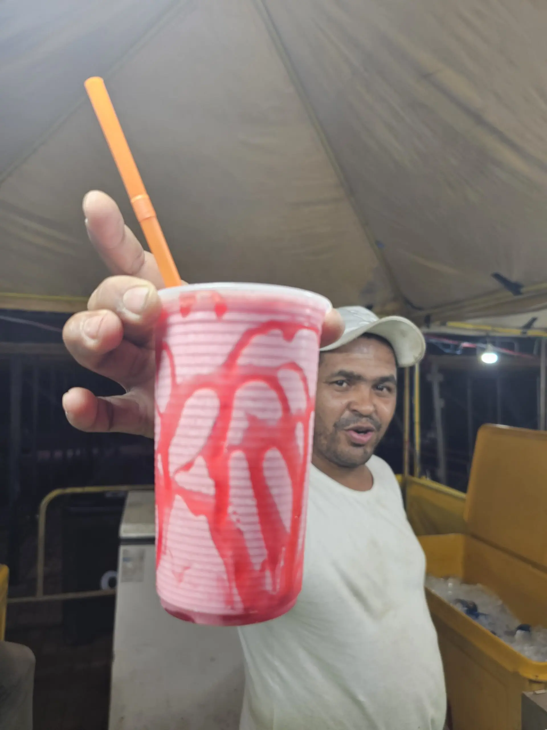 O dono da barraca, explica que a receita mistura vodka, cachaça, leite condensado e gelo.