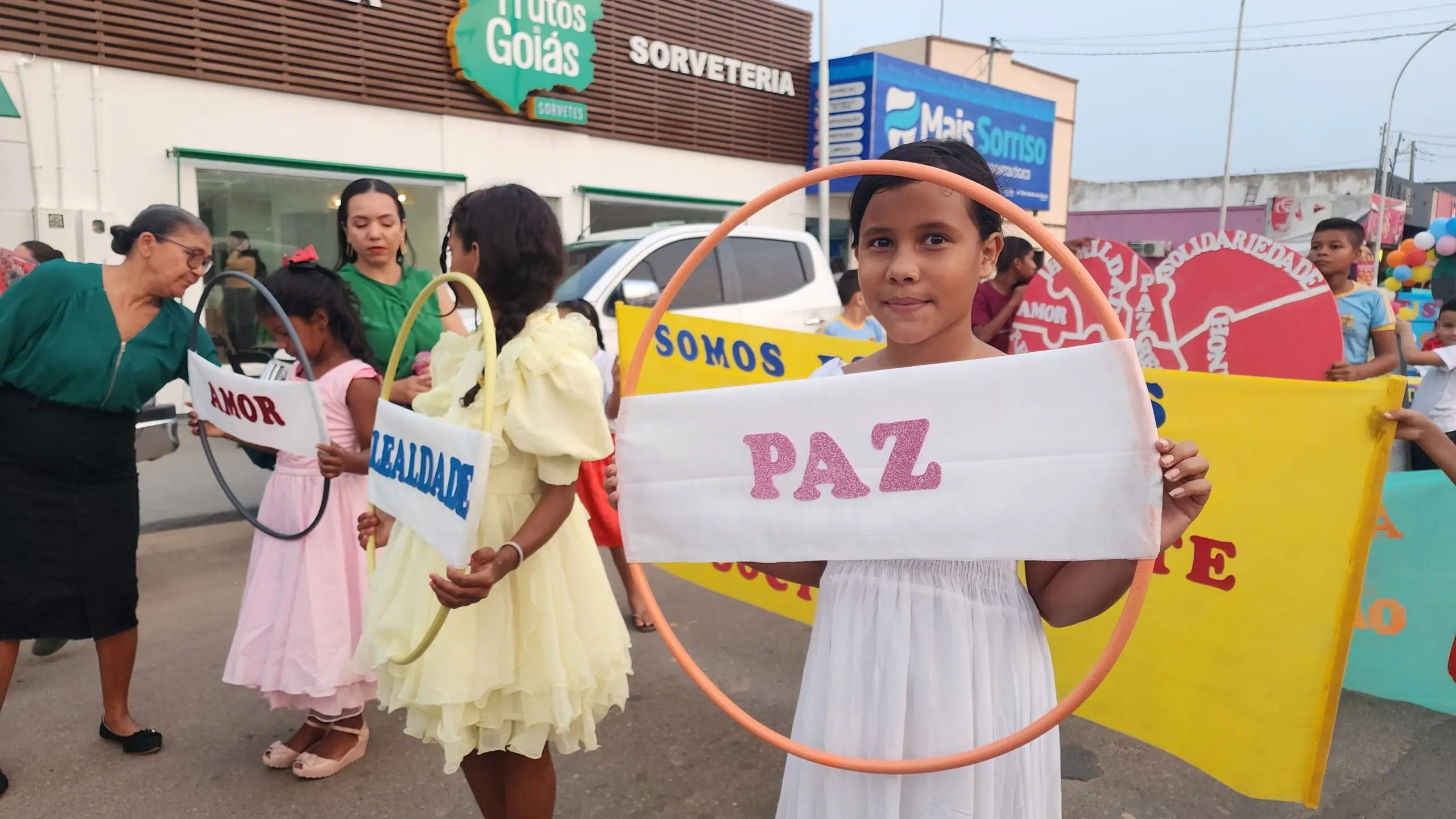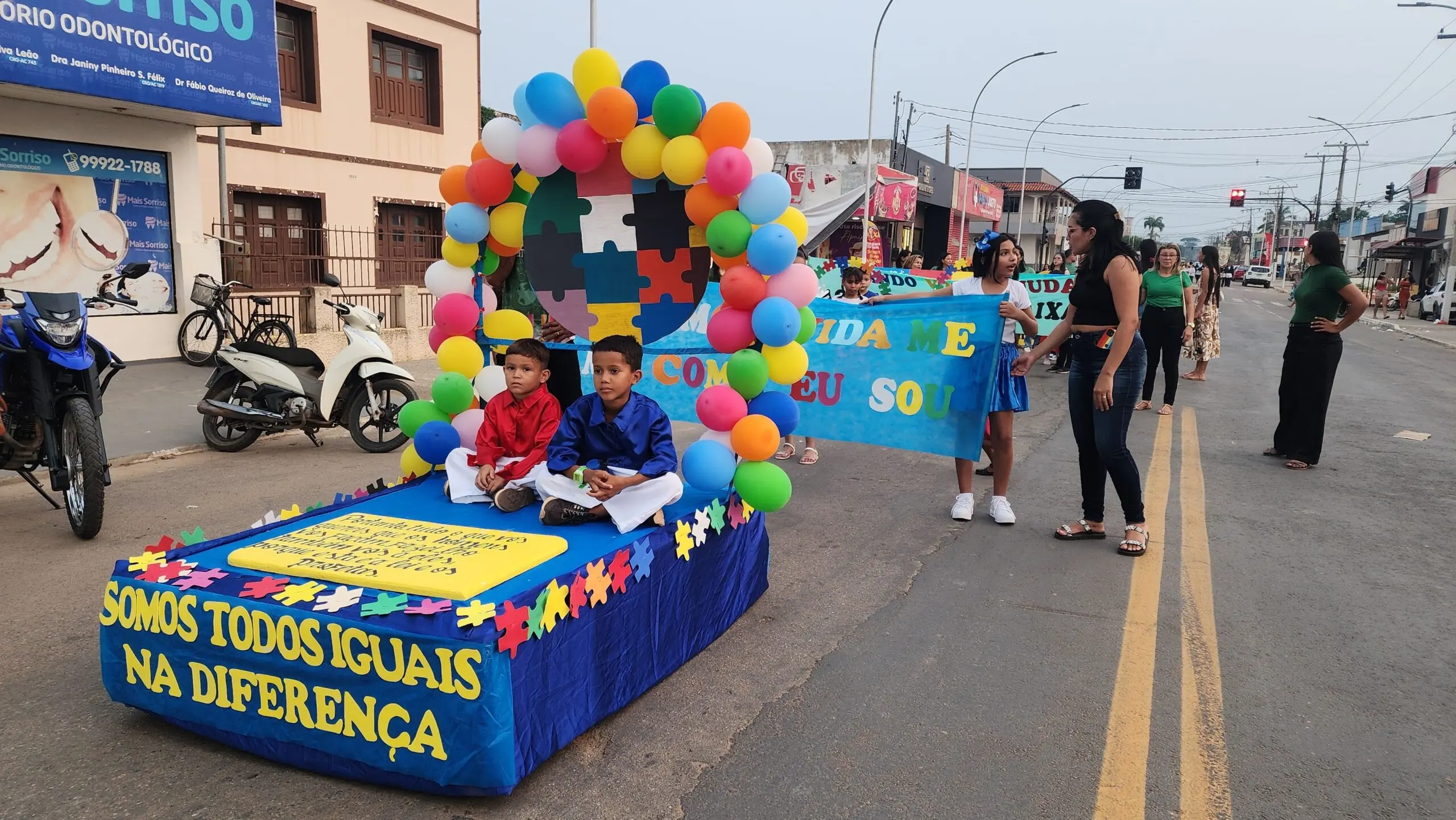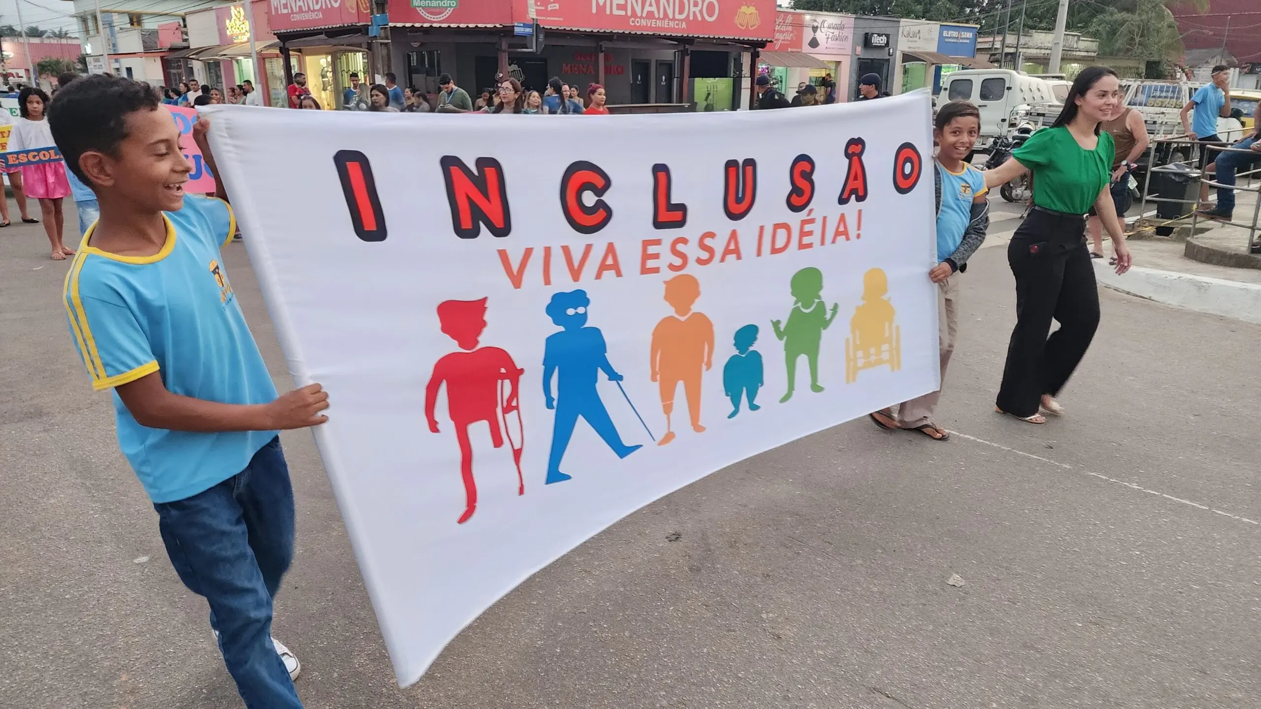 A avenida Avelino Chaves, onde aconteceu o desfile, foi tomada por cores, bandeiras e o entusiasmo da multidão, mas algo se destacou entre os alunos que marchavam: um grupo de crianças segurava faixas e cartazes pedindo educação inclusiva para todos.