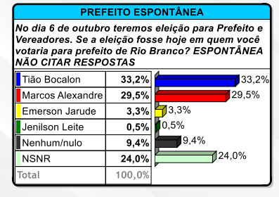 Na pesquisa espontânea, quando os nomes dos candidatos não são apresentados, Bocalom também aparece na frente com 33,2%, seguido de Marcus Alexandre com 29,5%, Emerson Jarude com 3,3% e Jenilson Leite com 0,5%. Nenhum/nulo são 9,4% e não souberam responder foram 24%.