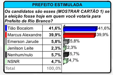 Na pesquisa induzida, em que os nomes dos candidatos são apresentados, o nome do prefeito e candidato a reeleição, Tião Bocalom (PL), aparece na frente com 41,6%, seguido de Marcus Alexandre (MDB), com 39,9%. O candidato Emerson Jarude (NOVO) aparece em terceiro, com 5,8% das intenções de votos e Jenilson Leite (PSB) com 2,3%. Nenhum/nulo são 5,7% e não souberam responder são 4,7%.