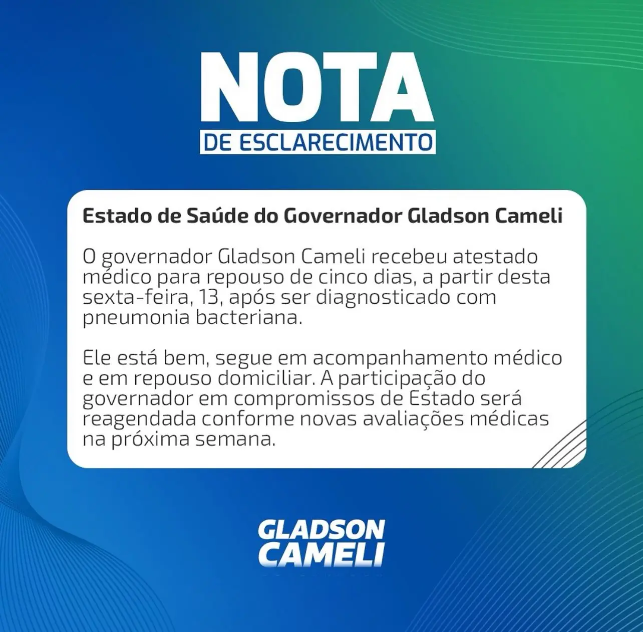 O governador Gladson Cameli foi diagnosticado com pneumonia bacteriana e vai precisar ficar afastado do Governo do Estado por cinco dias. A informação foi divulgada pela assessoria do governador neste sábado (14).