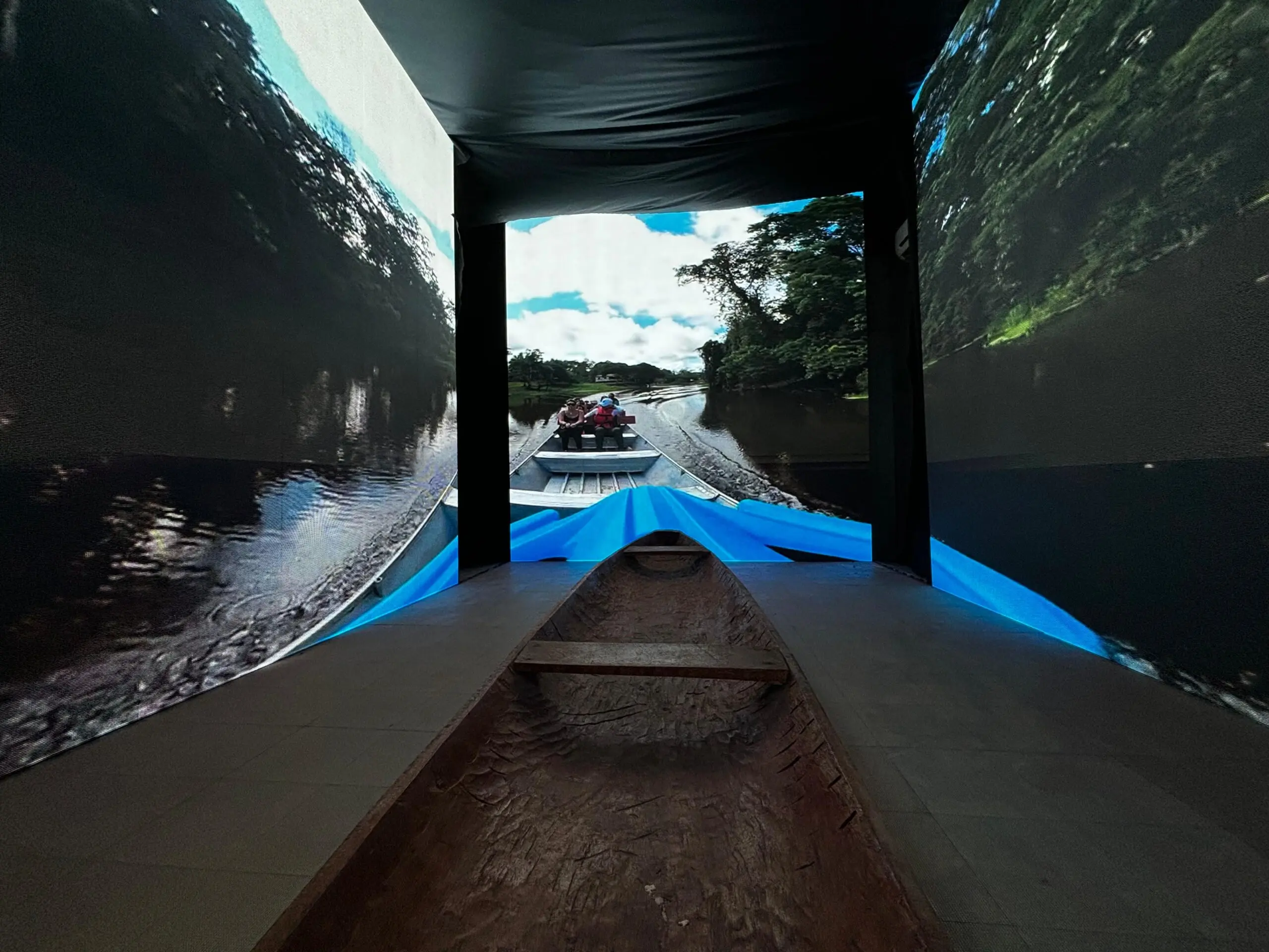 A parte do estande dedicada à trilha de Chico Mendes simula uma caminhada pela mata, enquanto outra área oferece uma vivência no Rio Croa com telões de LED que recriam o cenário.
