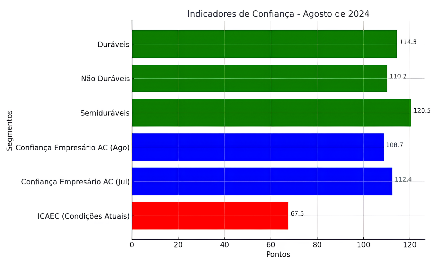 No Acre, a Federação do Comércio do Estado (Fecomércio-AC) acompanha os indicadores regionais. Em agosto de 2024, o índice de confiança do empresário acreano recuou para 108,7 pontos, abaixo dos 112,4 pontos registrados em julho. Apesar do recuo, o indicador ainda demonstra uma expectativa positiva para os próximos meses.