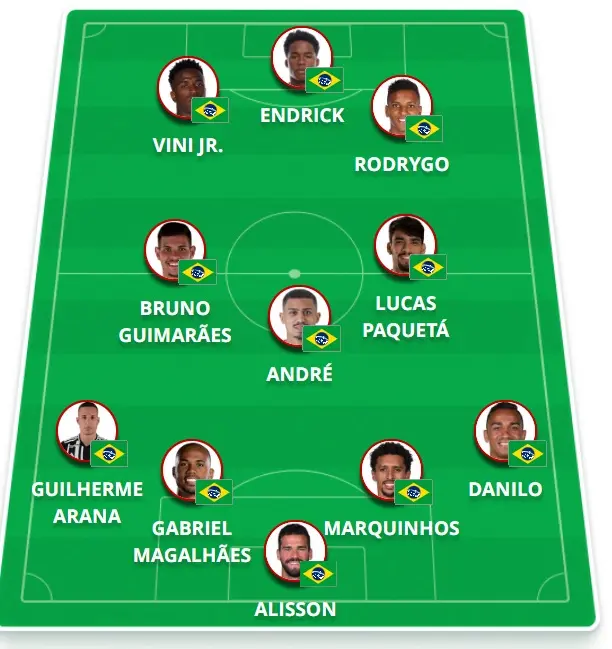 Provável escalação: Alisson, Danilo, Marquinhos, Gabriel Magalhães e Guilherme Arana; André, Bruno Guimarães e Lucas Paquetá; Rodrygo, Endrick e Vini Júnior.